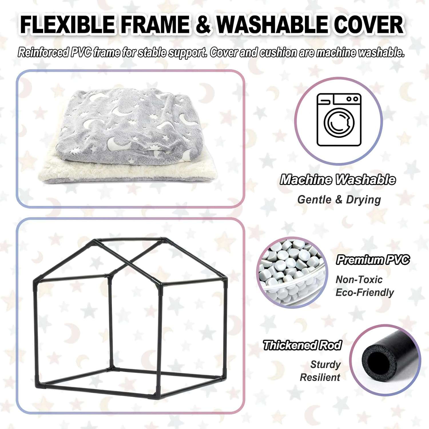 Diseño Luminoso Mágico: Su cubierta exterior está fabricada con una suave superficie de franela que incluye un hermoso patrón de estrellas y lunas. Estos detalles brillan sutilmente en la oscuridad, creando un ambiente nocturno relajante y muy decorativo en tu habitación sin interrumpir el sueño de tu perro.