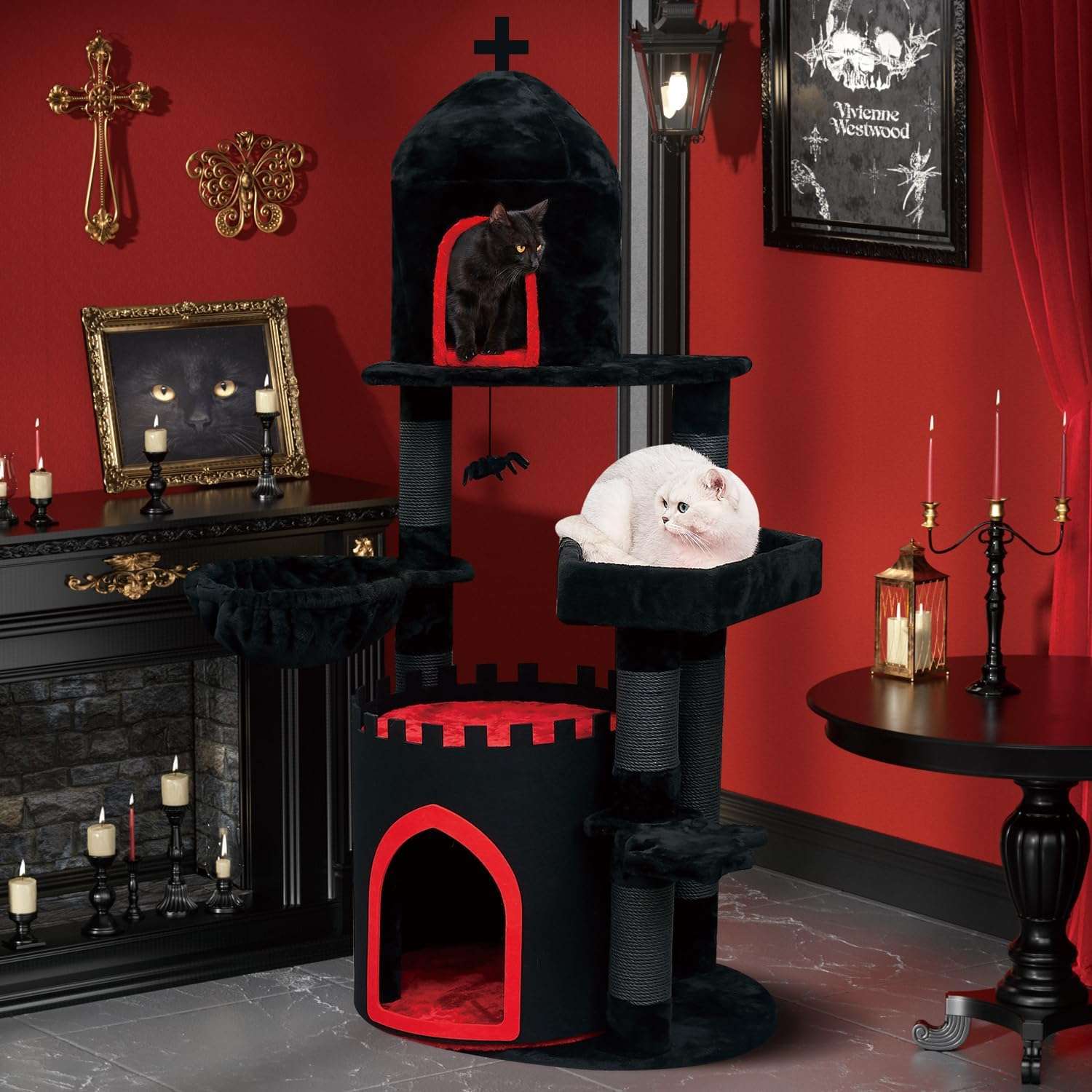 Diseño Temático y Lujo Multi-Piso: Funciona como decoración de Halloween y como torre para gatos durante todo el año. Incluye dos condominios, camas tipo ataúd y plataformas. La espuma de alta densidad garantiza una comodidad duradera para gatos grandes. La construcción de varios pisos garantiza que cada gato pueda descansar sin ser molestado por otros gatos.