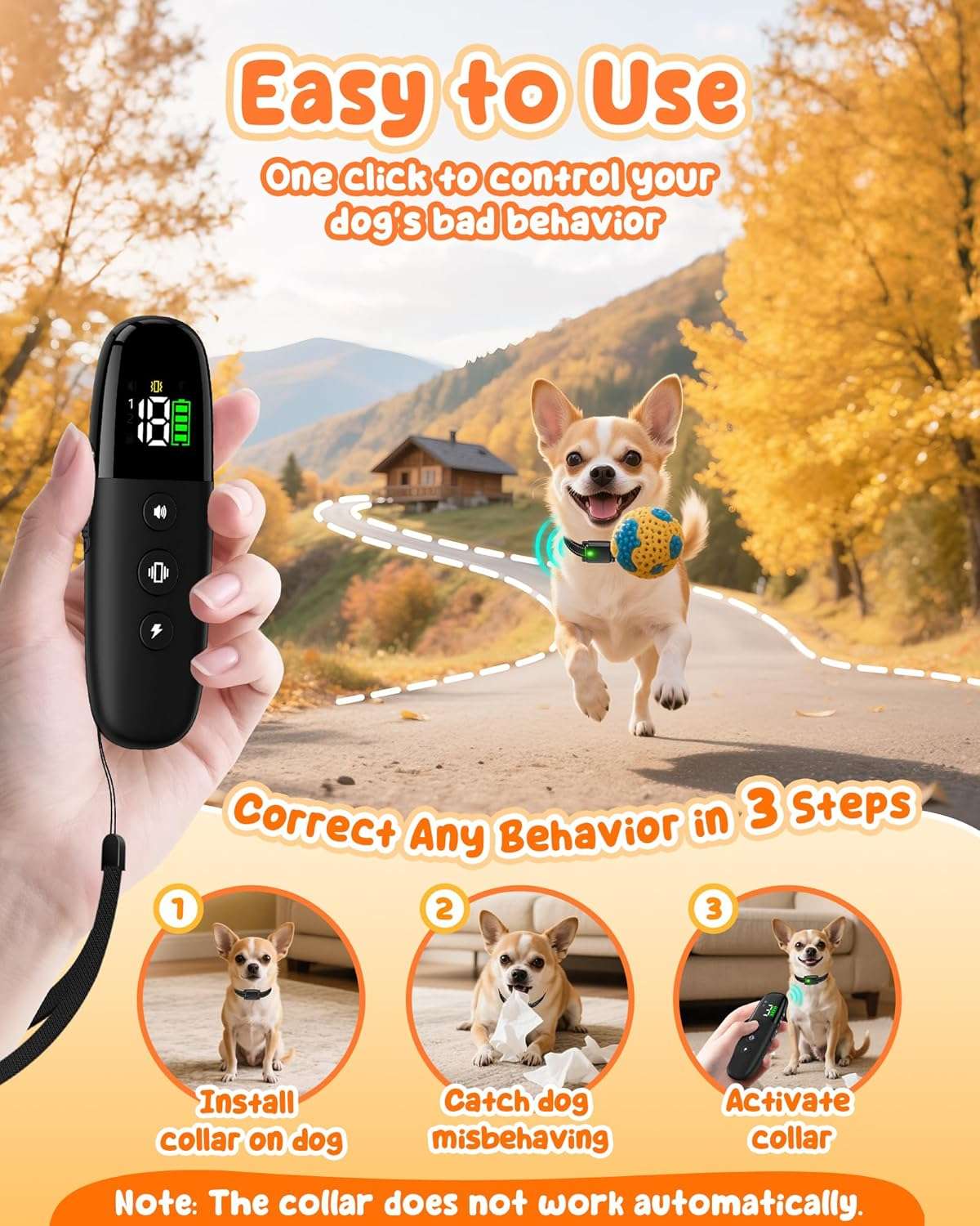 3 Modos de Entrenamiento Suaves y Seguros: Entrene con tranquilidad. Cuenta con modo de Sonido (pitido), Vibracion ajustable (1-18 niveles) y Estimulacion suave (0-8 niveles). La vibracion suele ser suficiente para captar la atencion de perros pequeños, haciendo el adiestramiento muy humanitario.
