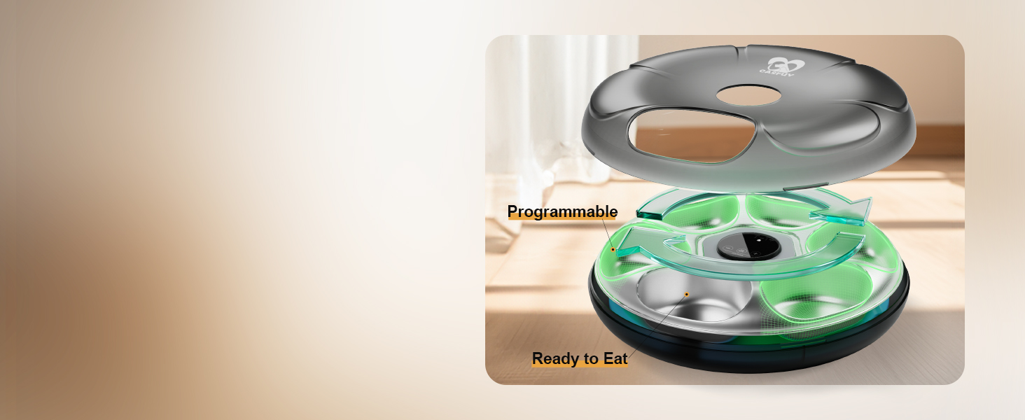 Alimentación programada para comida húmeda y seca A diferencia de los dispensadores de torre que solo aceptan pellets, este comedero cuenta con 6 bandejas independientes. Esto permite ofrecer a su mascota una dieta equilibrada que incluya comida húmeda, sobres (wet food) o raciones frescas. Puede programar hasta 5 comidas automáticas más una inmediata, ideal para mantener la rutina de su gato o perro pequeño durante el día o el fin de semana.