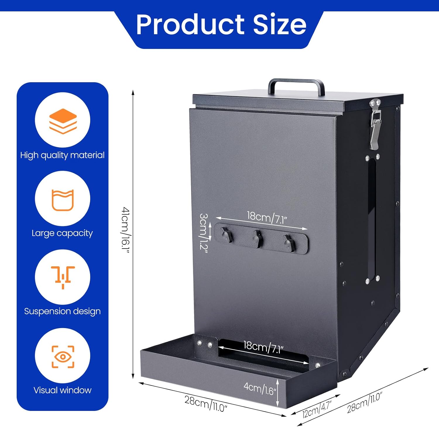 Construcción Blindada en Metal Galvanizado: Durabilidad extrema. A diferencia de los dispensadores de plástico que pueden ser mordidos o dañados, este modelo está hecho completamente de metal galvanizado. Su boca de salida de 18 cm x 3 cm está diseñada para que el alimento caiga de forma fluida sin atascarse, mientras que el fondo profundo del plato evita que el pellet salte fuera de la jaula.