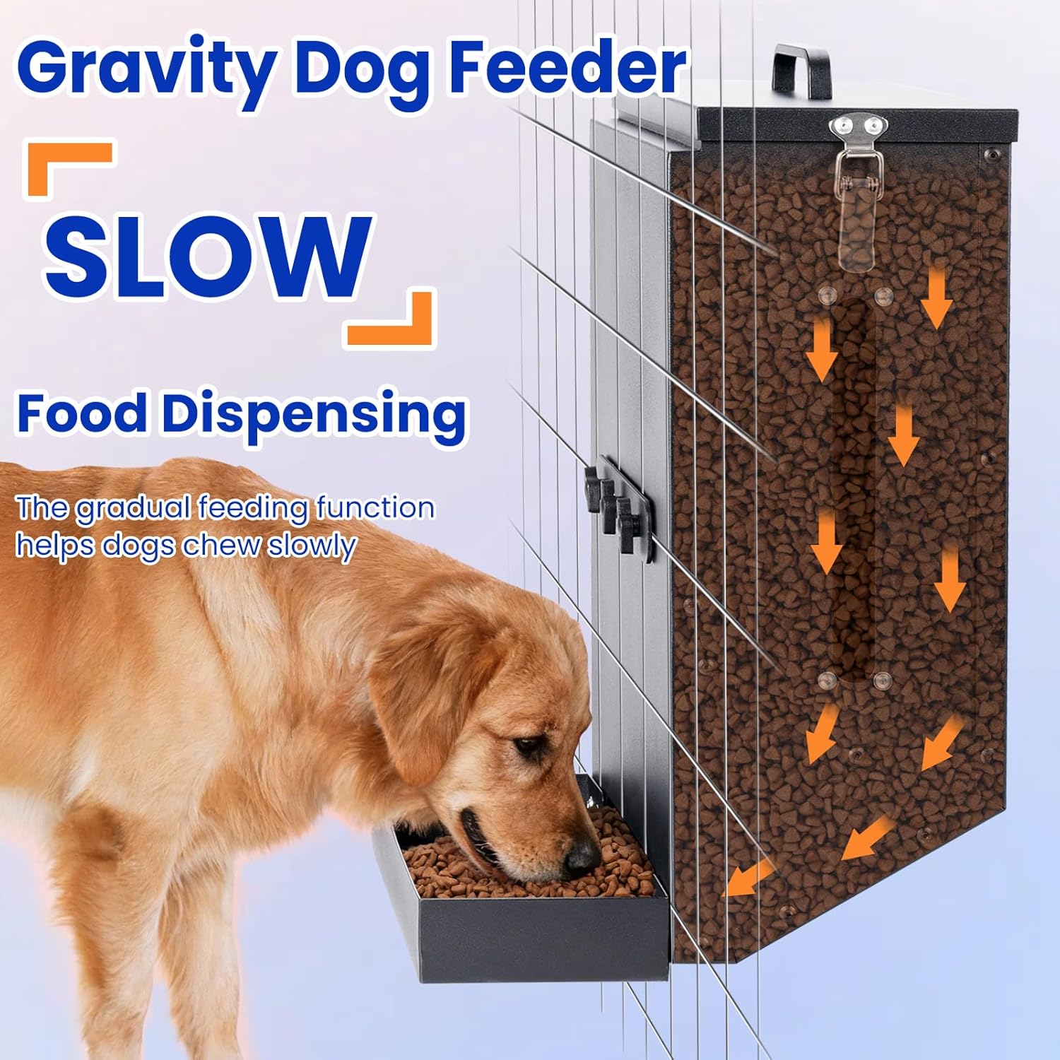 Característica: Detalle Capacidad de Alimento: 7.7 Kilogramos Material: Metal galvanizado reforzado Tipo de Montaje: Colgante para jaula o canil con placa de seguridad Sistema de Funcionamiento: Gravedad natural (Sin electricidad) Dimensiones de la Boca de Salida: 18 cm de largo x 3 cm de ancho Compatibilidad: Perros de razas grandes y medianas
