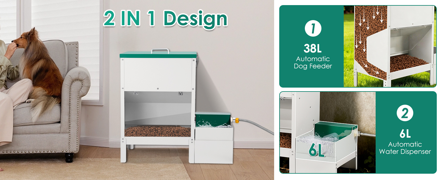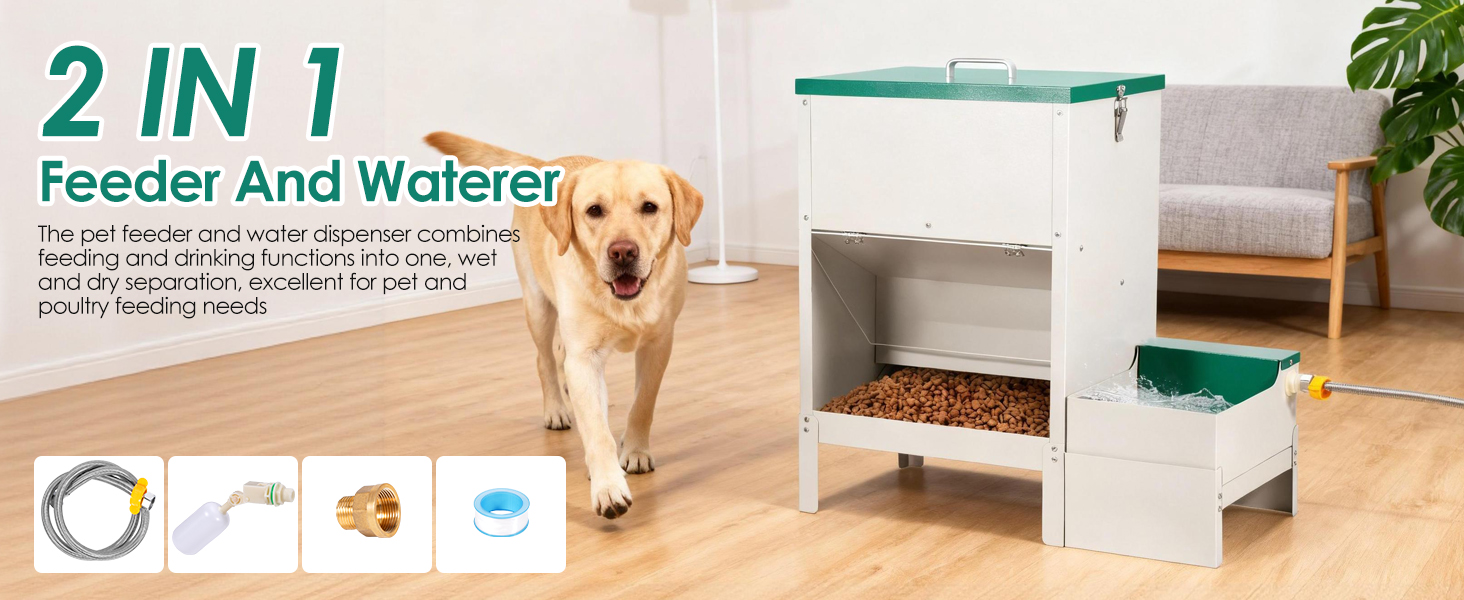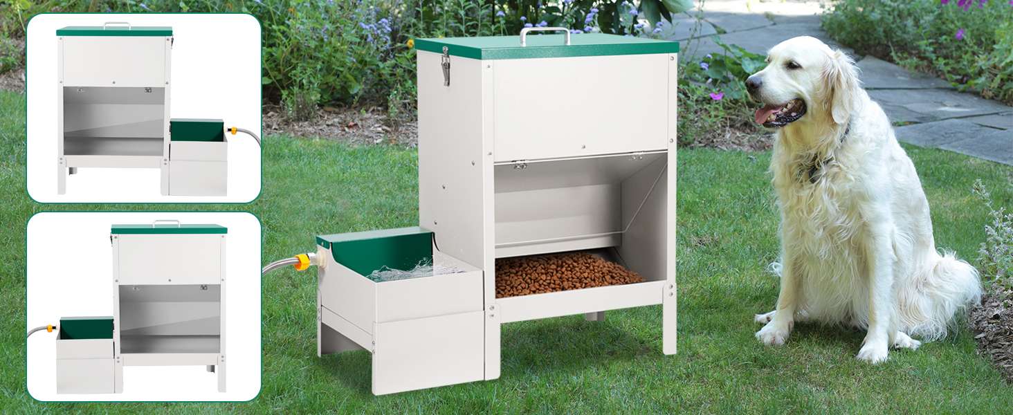 Esta estación de alimentación integral es la solución profesional para el cuidado de perros de razas grandes, múltiples mascotas o animales de corral. El sistema combina un dispensador de alimento seco de gran volumen con un bebedero automático de flujo constante en una sola estructura de acero inoxidable, garantizando una separación higiénica entre el agua y la comida.