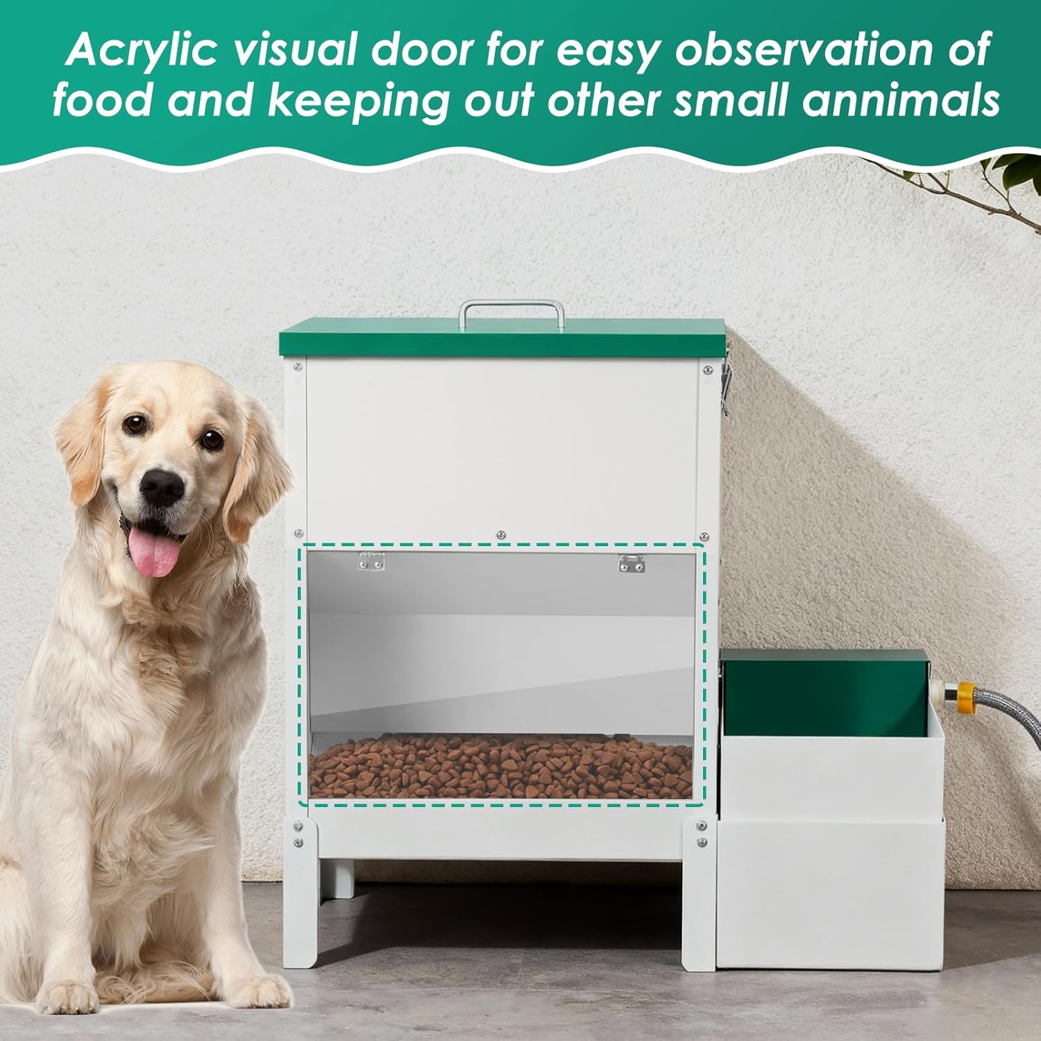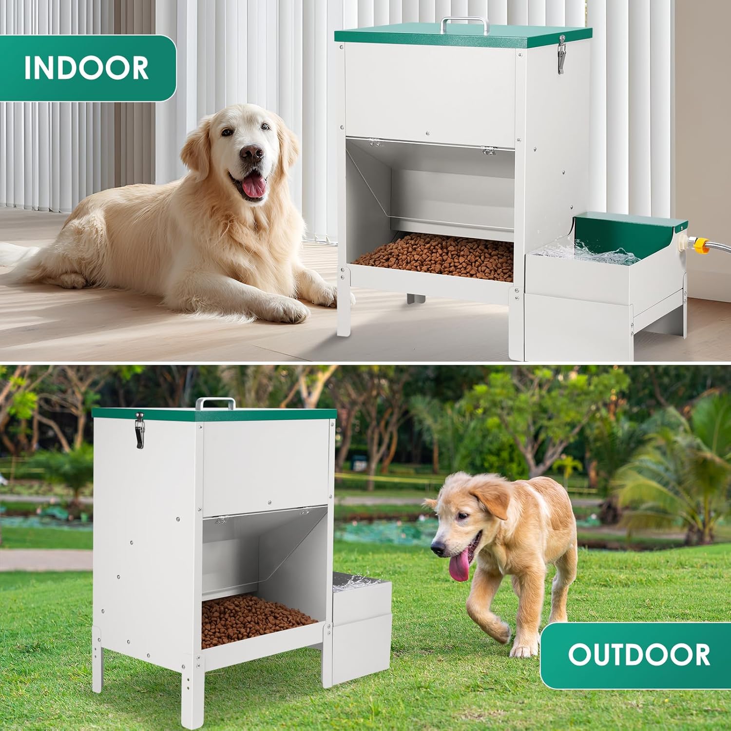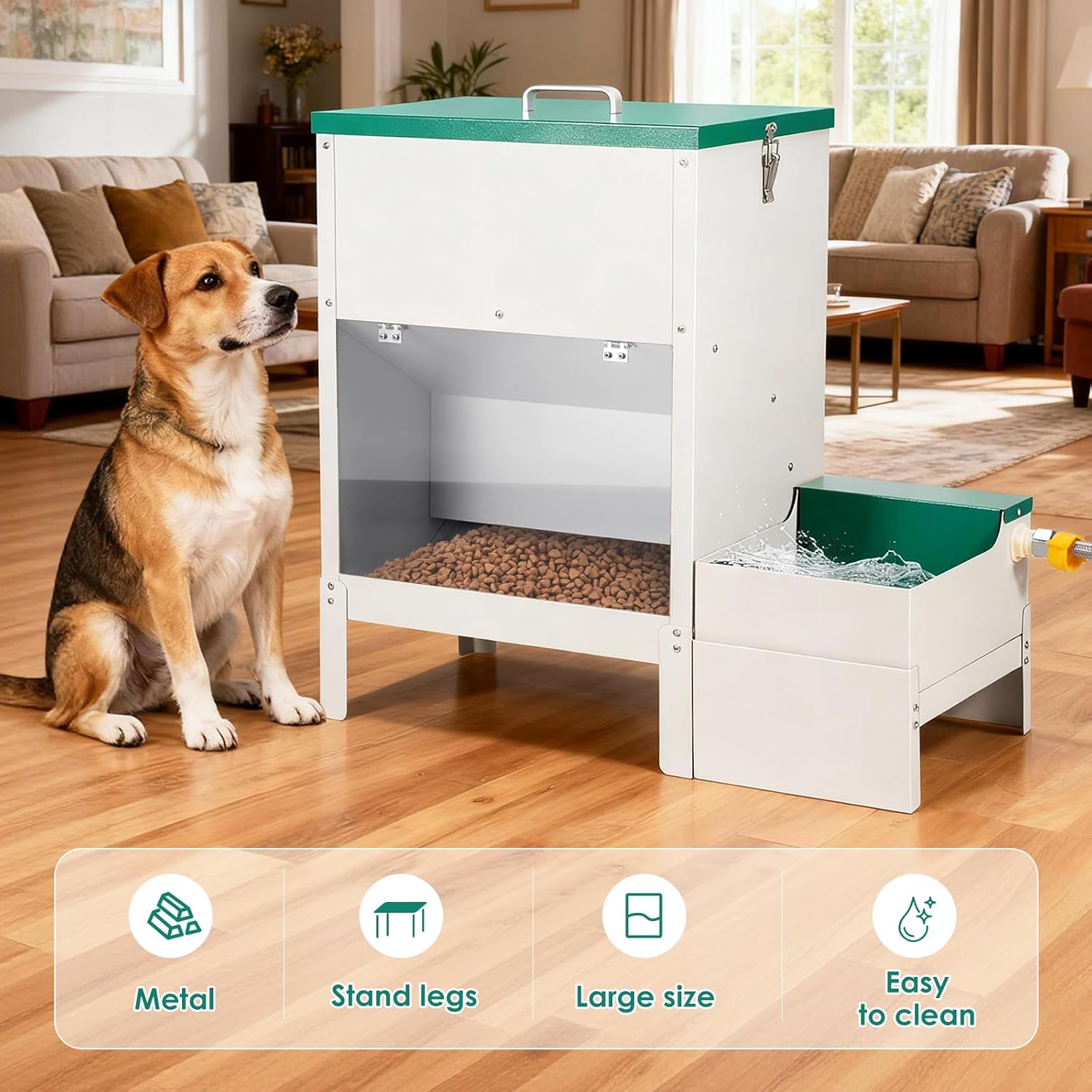 Esta estación de alimentación integral es la solución profesional para el cuidado de perros de razas grandes, múltiples mascotas o animales de corral. El sistema combina un dispensador de alimento seco de gran volumen con un bebedero automático de flujo constante en una sola estructura de acero inoxidable, garantizando una separación higiénica entre el agua y la comida.