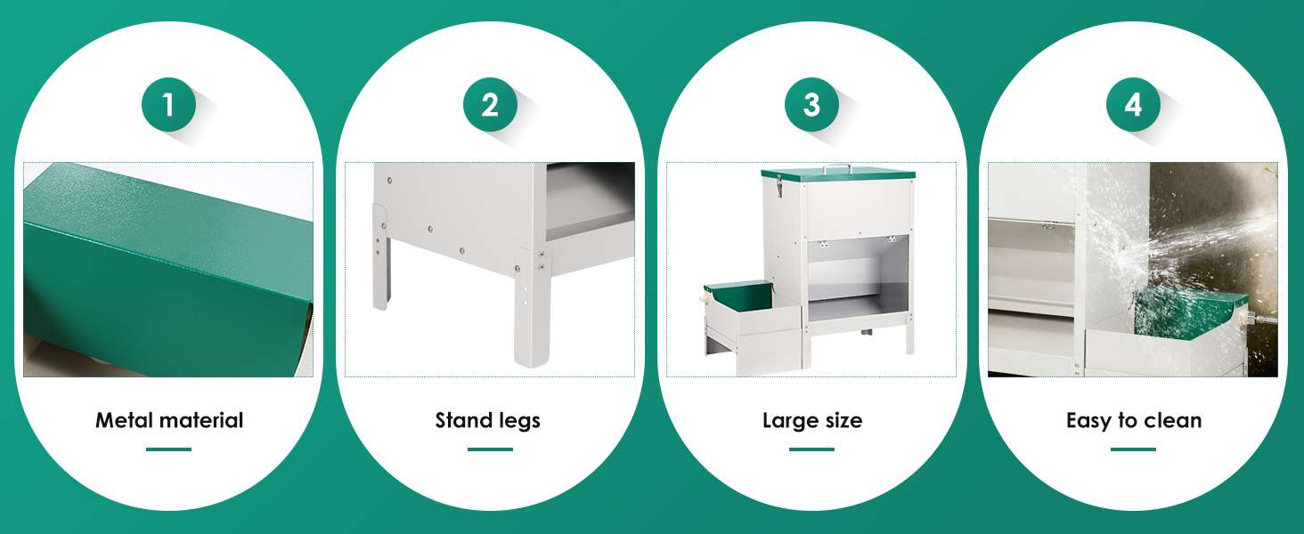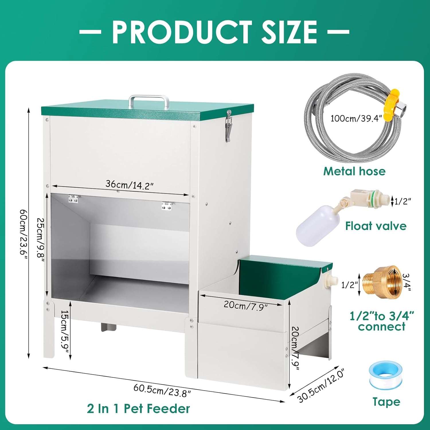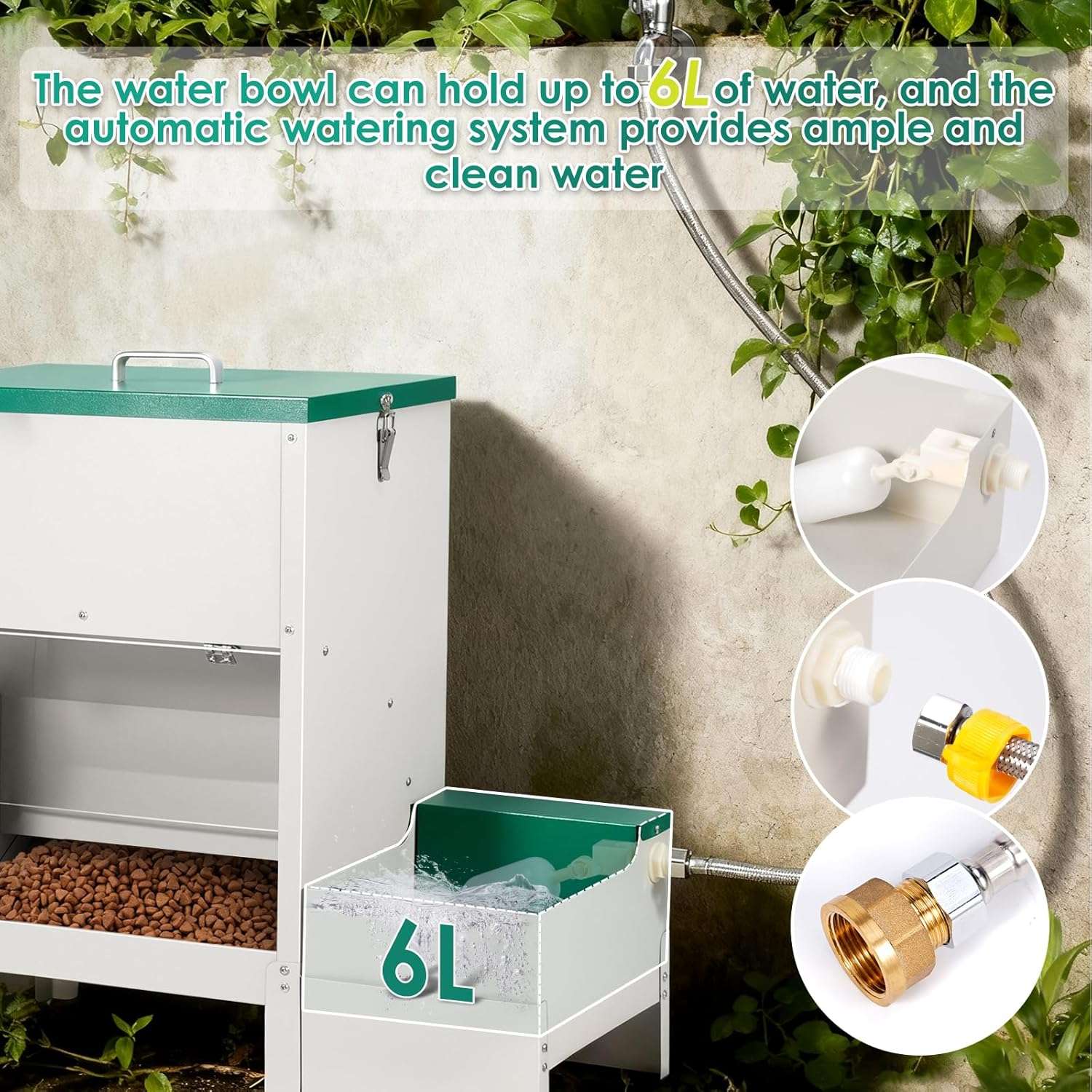 Caracteristica: Detalle Capacidad de Alimento: 38 Litros (Aproximadamente 19 Kilogramos) Capacidad de Agua: 6 Litros con autorelleno Material Principal: Acero Inoxidable grueso y Metal reforzado Sistema de Comida: Caída por gravedad natural (Sin electricidad) Sistema de Agua: Válvula de flotador automática Instalación: Apto para Interior y Exterior (Resistente al clima) Accesorios: Manguera, adaptador de agua y 2 flotadores incluidos