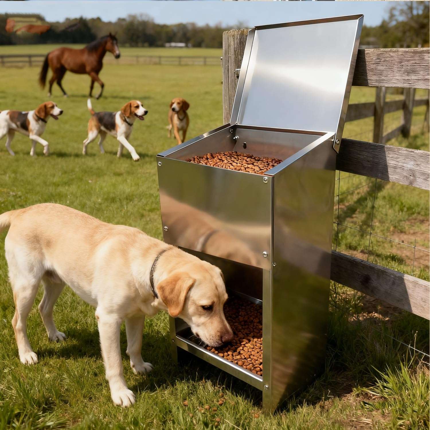 Puerta magnética inteligente contra plagas Este modelo incluye una puerta con cierre magnético suave que se abre solo cuando el perro la empuja para comer. Esto evita que moscas, ratones o aves entren al depósito, manteniendo el alimento limpio, seco y libre de contaminantes externos, algo vital para la salud de sus animales en exteriores.