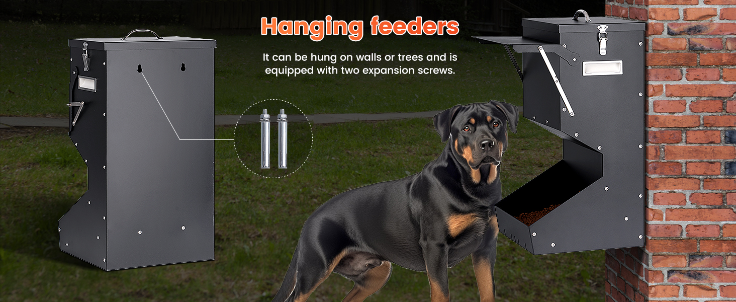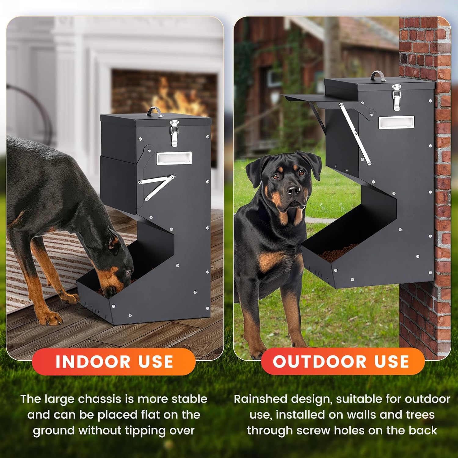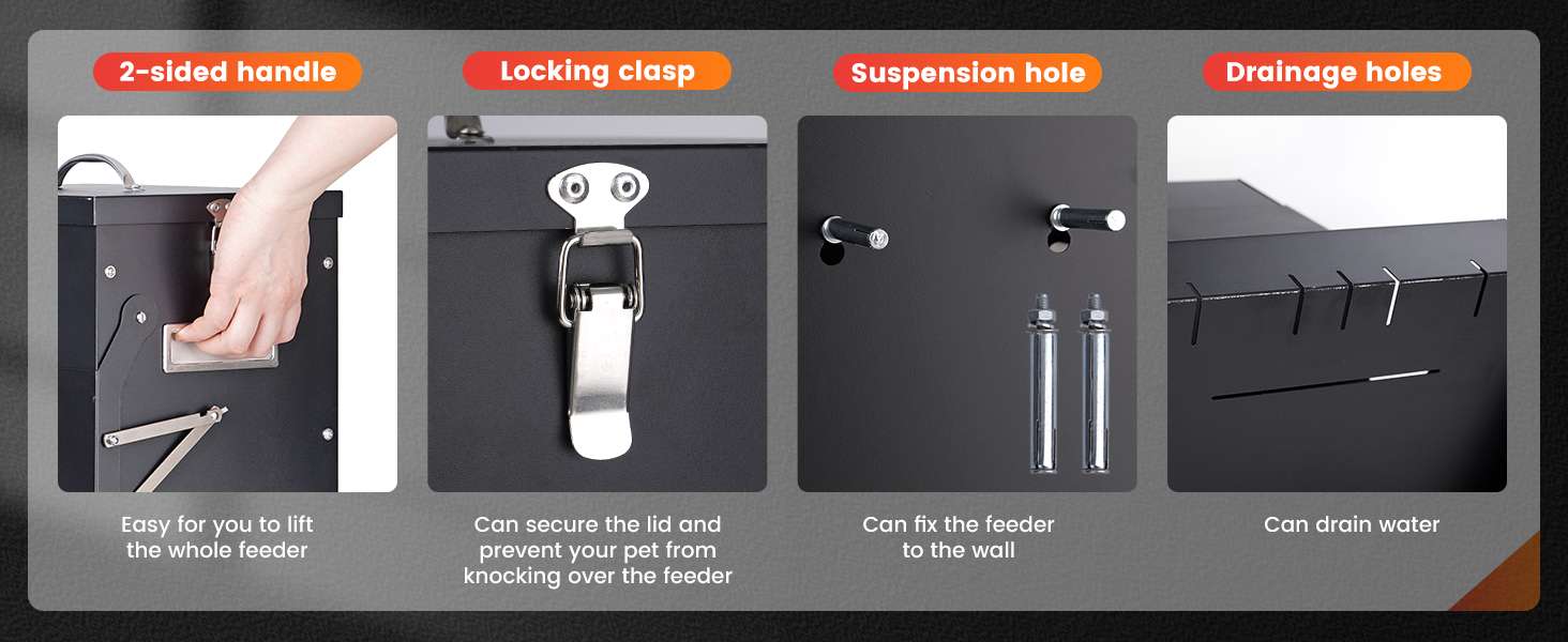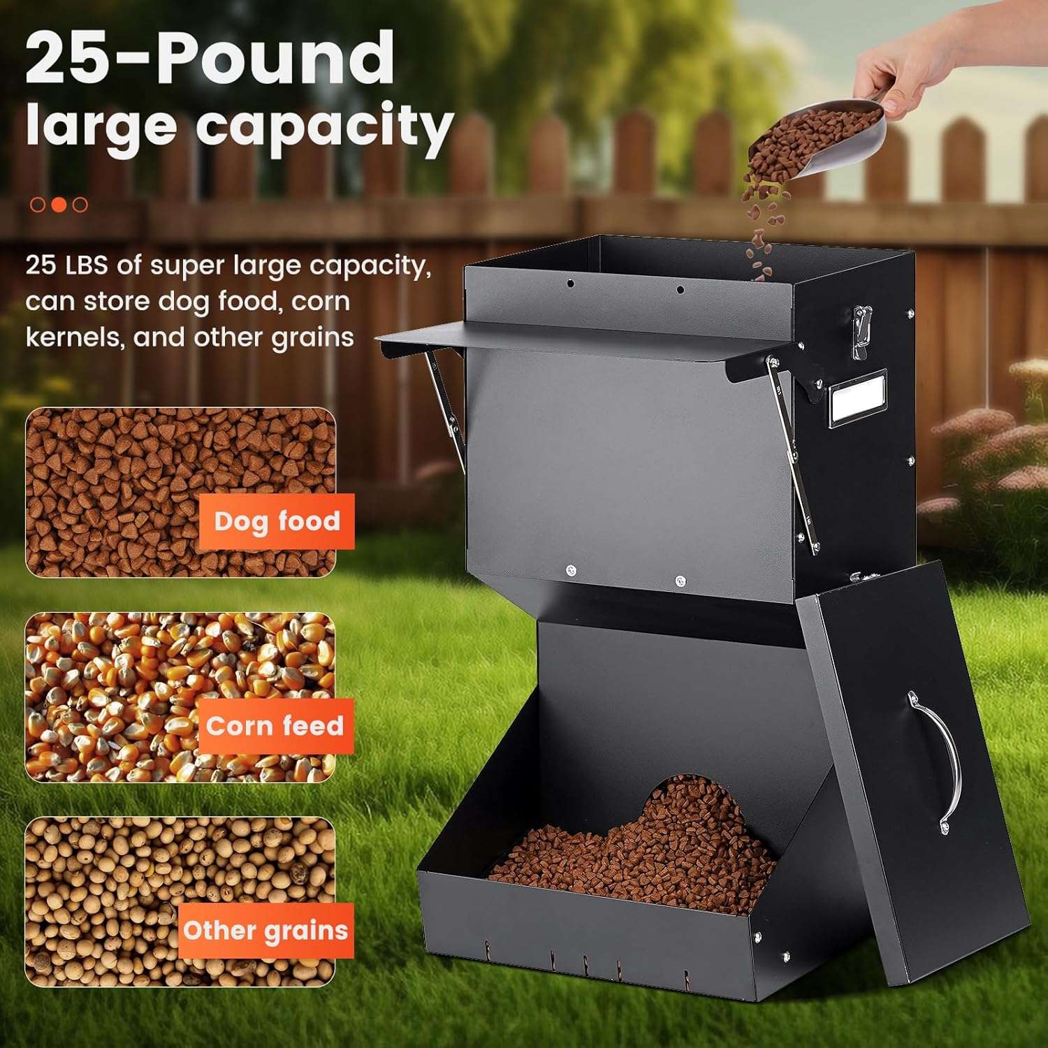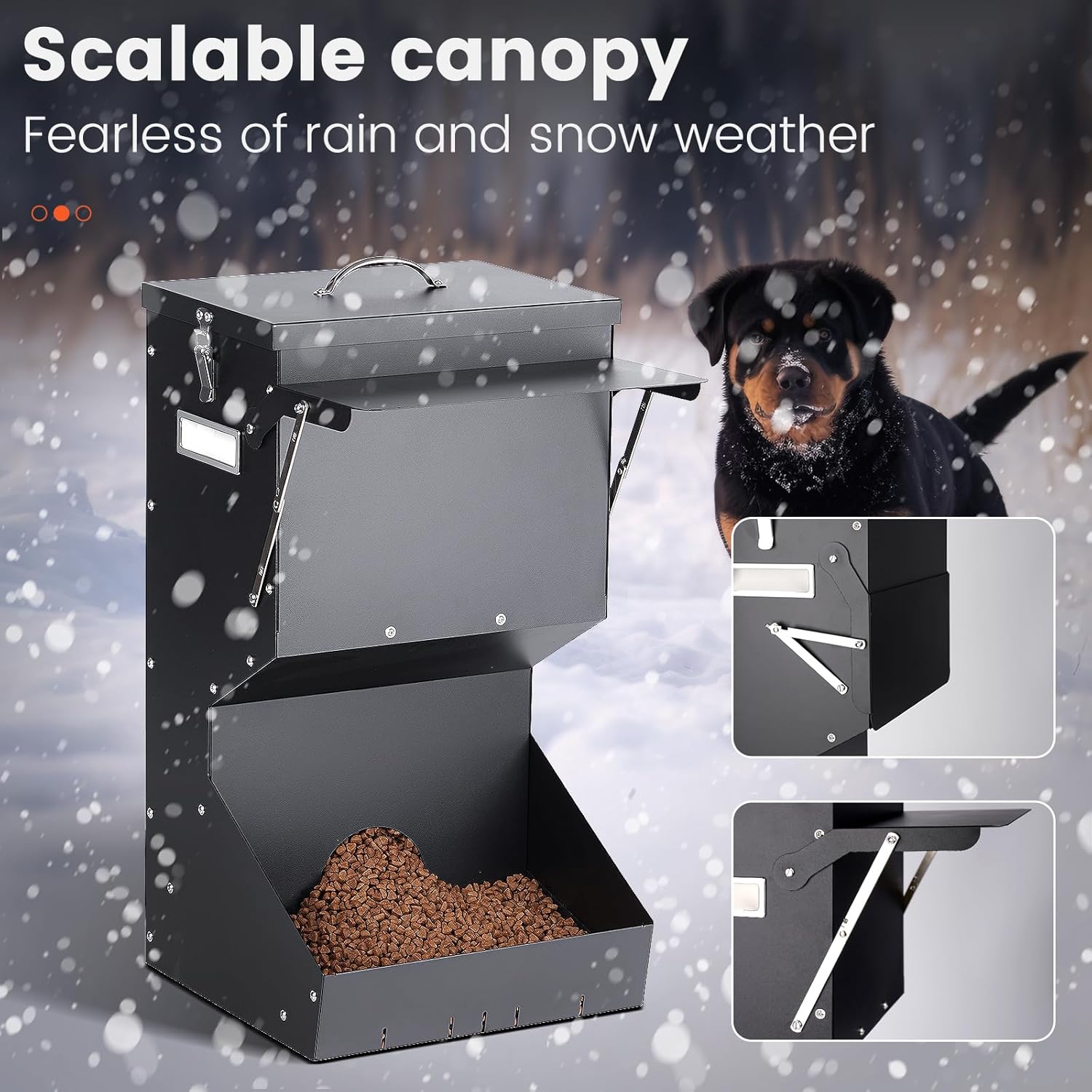 Protección Avanzada contra el Clima: Aleros de lluvia integrados. Diseñado específicamente para el uso al aire libre, cuenta con aleros superiores que bloquean la entrada de agua de lluvia al depósito. Además, incorpora un canal de drenaje en la parte inferior para eliminar rápidamente cualquier resto de humedad o agua residual, manteniendo el alimento seco, fresco y libre de moho.