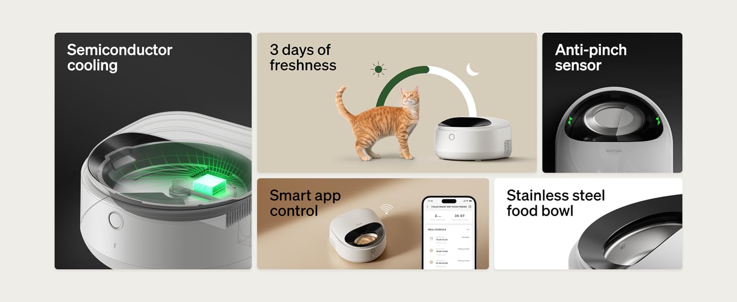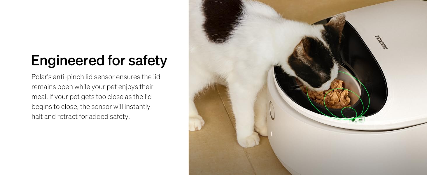 Seguridad avanzada y cuidado digestivo Equipado con sensores infrarrojos de alta sensibilidad, el comedero detecta la presencia de su mascota y retrasa el cierre de la tapa para evitar pellizcos o accidentes. Además, pensando en la digestión, el sistema permite que el alimento pierda el frío extremo 30 minutos antes de la hora programada, resaltando el sabor y aroma de la comida para que su mascota disfrute una experiencia nutritiva y segura.