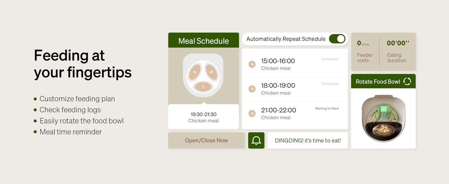 Control inteligente WiFi y alimentación inmediata Gestione la dieta de su mascota desde cualquier lugar a través de la aplicación móvil. Puede programar los horarios de las 3 comidas, recibir notificaciones de alimentación exitosa o usar la función de apertura inmediata si desea premiar a su mascota. Si su gato no terminó su ración, usted puede reabrir el compartimento remotamente, asegurando que nada de alimento se desperdicie.