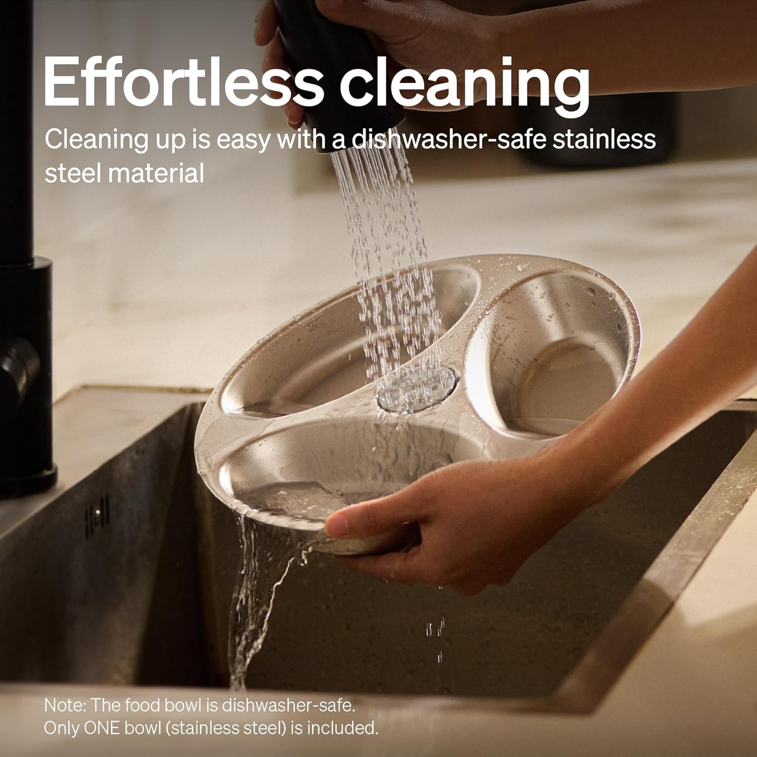 Higiene superior con acero inoxidable La salud de su mascota es lo más importante. Este dispensador incluye una bandeja de acero inoxidable premium, material recomendado por veterinarios para evitar la acumulación de grasa y bacterias que causan el acné felino (puntos negros en el mentón). La bandeja es totalmente extraíble y apta para lavavajillas, facilitando una limpieza profunda y rápida en su hogar.