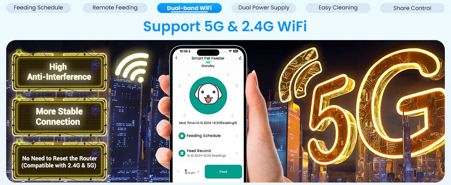 Tecnología 5G y seguridad garantizada Olvídate de las desconexiones. El soporte para WiFi 5G asegura que el equipo responda al instante a tus comandos. Pensado para la realidad local, cuenta con un sistema de energía dual: ante un corte de luz, las pilas de respaldo mantienen el horario de alimentación intacto. Además, su tanque transparente de 3.2 kg te permite ver de un vistazo cuánta comida queda, mientras que los platos de acero inoxidable aseguran una higiene total y previenen el acné felino.