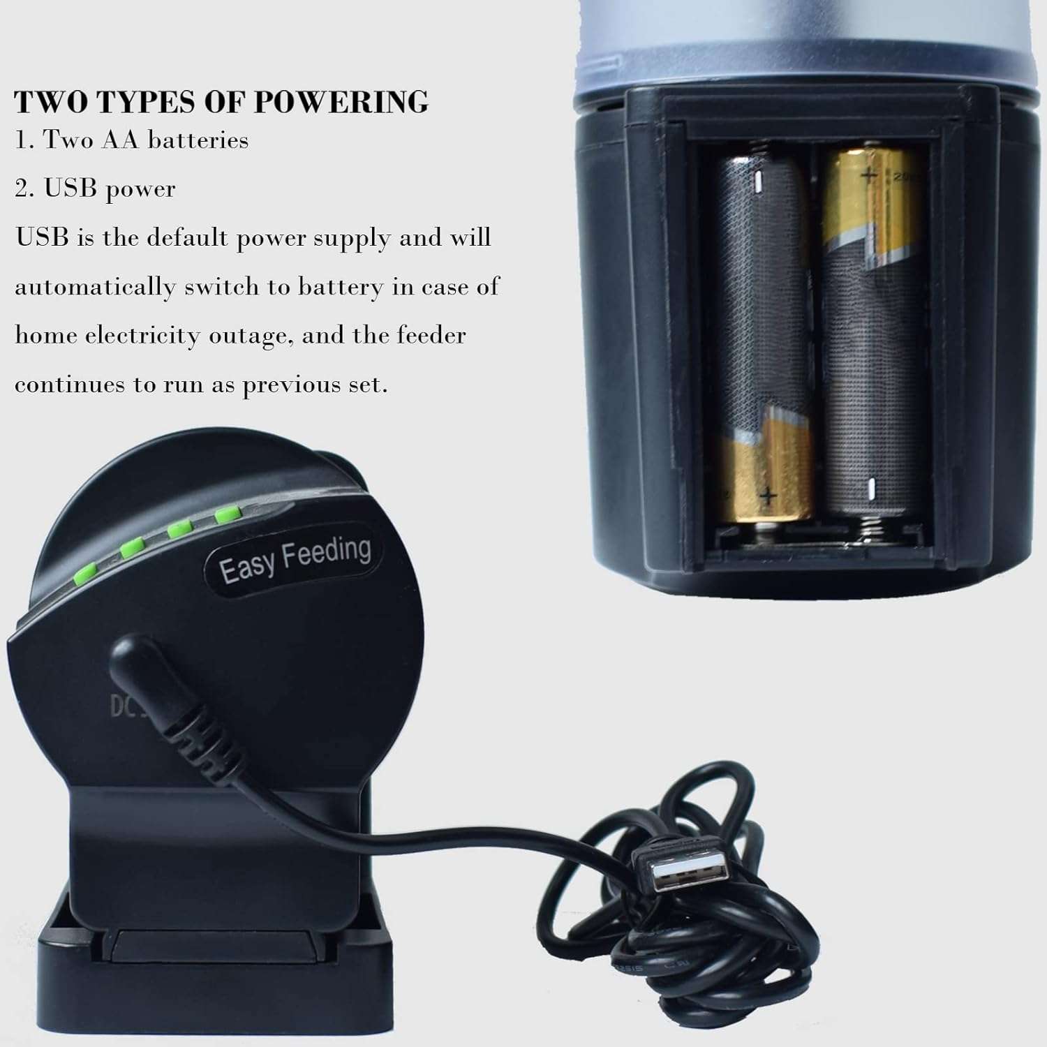 Dos tipos de fuente de alimentación: este alimentador automático de peces WiFi funciona con dos pilas AA (no incluidas) o utiliza un cable USB para conectar la electricidad del hogar, el cable USB de 6.6 pies está incluido. Se pueden utilizar dos fuentes de alimentación al mismo tiempo en caso de emergencia, como cortes de energía. El cable USB es la configuración predeterminada, si se corta la energía del hogar, la batería suministrará energía automáticamente. Nunca te preocupes por que tu mascota se muera de hambre como si estuvieras de viaje.