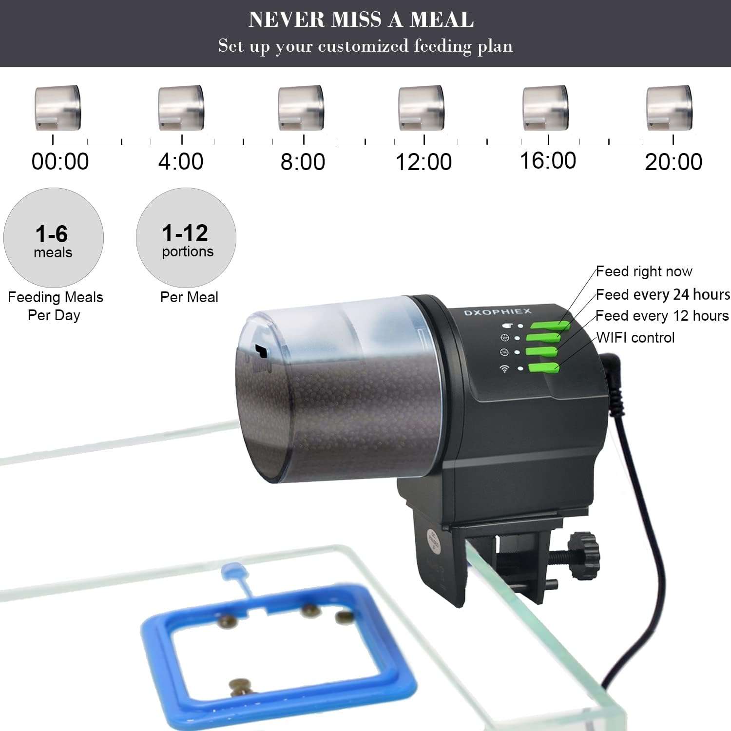 Fácil de añadir alimentos y ajustar el volumen: simplemente empuja la tapa de ajuste de alimentación para aumentar o disminuir el volumen de alimentación fácilmente. Este alimentador automático de peces wifi para acuario es adecuado para la mayoría de los tipos de alimentos como copos, patatas fritas, pellets, graduales, etc.