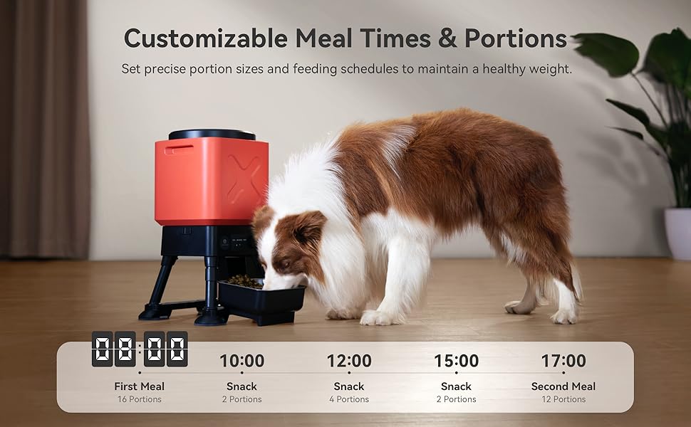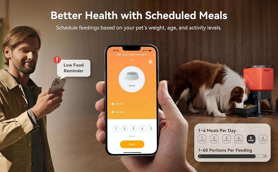 Aplicación inteligente y control WiFi Gestiona la alimentación de tu mascota desde cualquier lugar a través de tu celular. Con la aplicación para iOS y Android, puedes programar hasta 6 comidas al día y ajustar las porciones según las necesidades de tu perro. Es la solución perfecta para quienes trabajan fuera de casa o realizan viajes cortos.