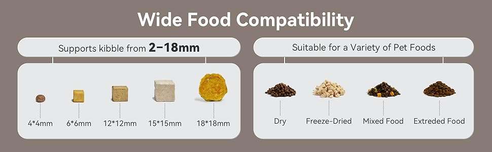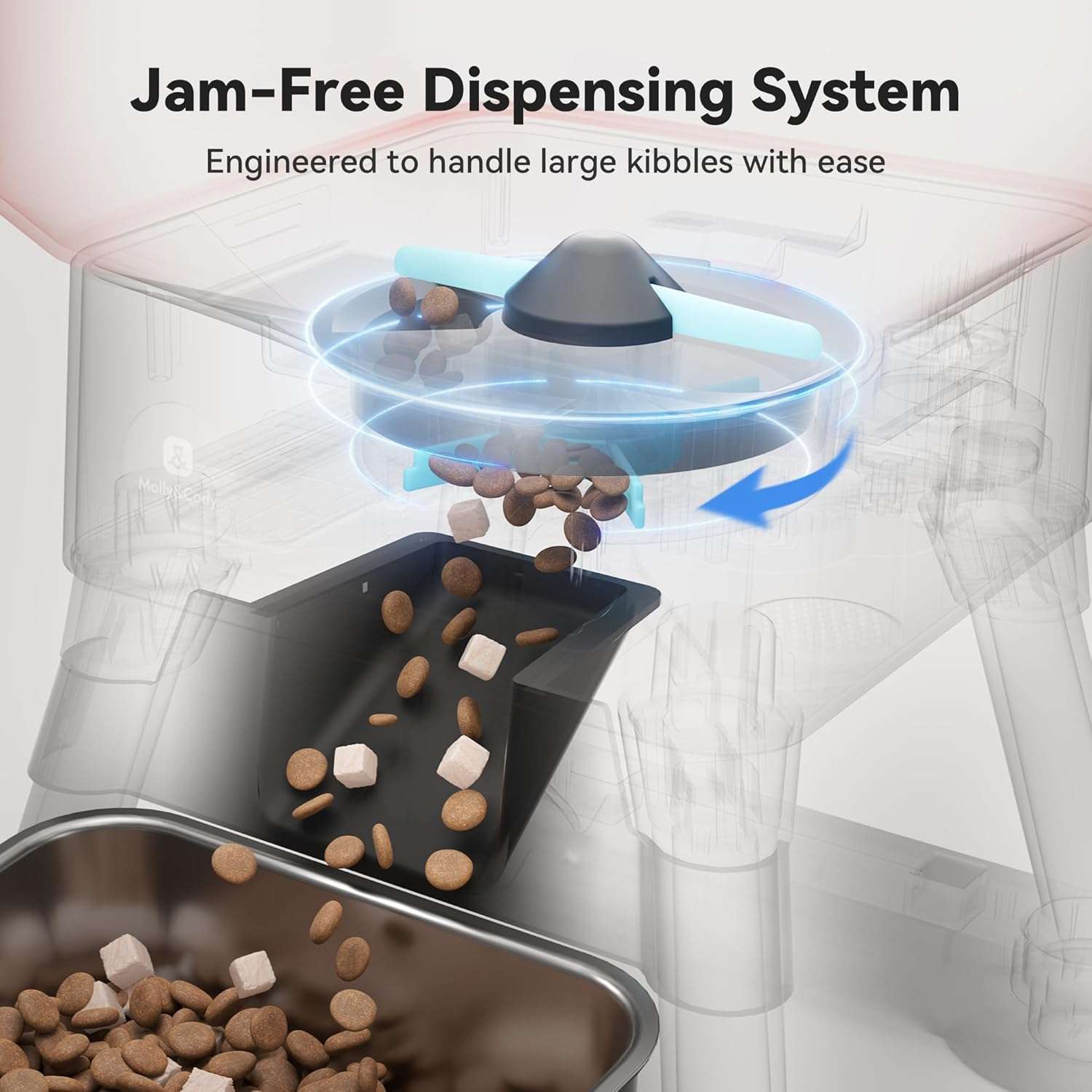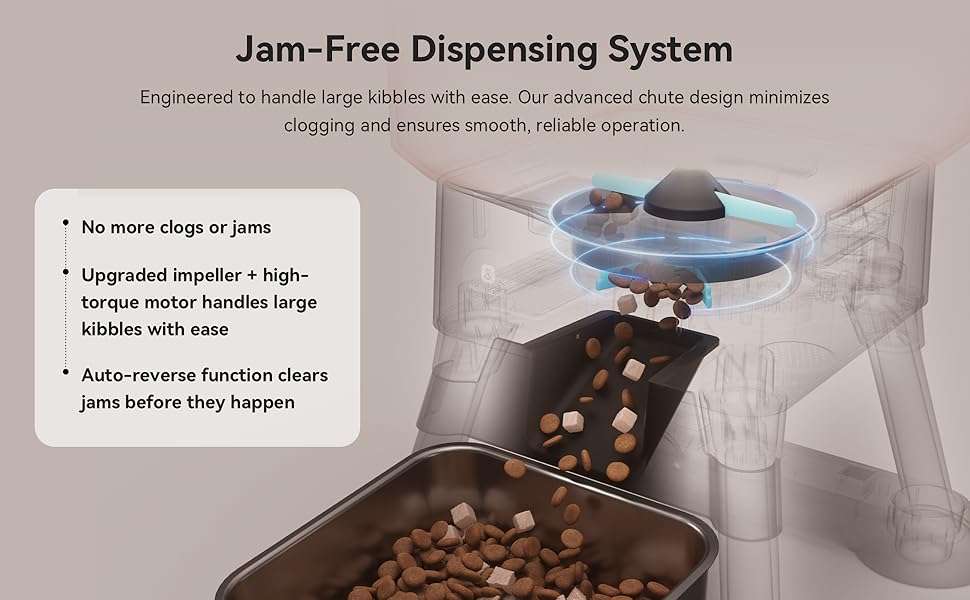 Sistema antibloqueo avanzado Cuenta con un motor de alta potencia y tecnología de última generación que evita que las croquetas se atasquen. Este sistema es compatible con alimentos liofilizados y croquetas de gran tamaño, asegurando que el dispensador funcione de manera fluida y constante en cada comida.