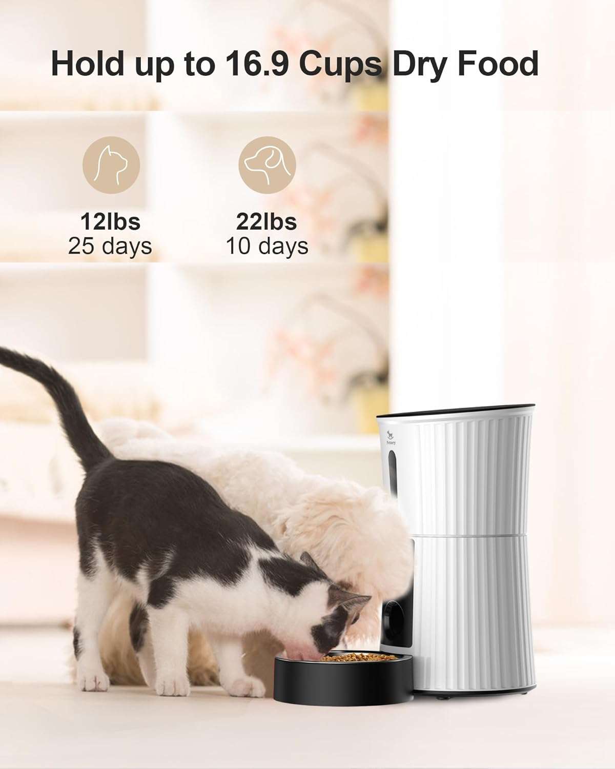 Comida siempre fresca: El depósito tiene capacidad para 2 kg de pellet (suficiente para unos 20 días en gatos) e incluye una bolsa desecante que mantiene el alimento crujiente y sabroso.