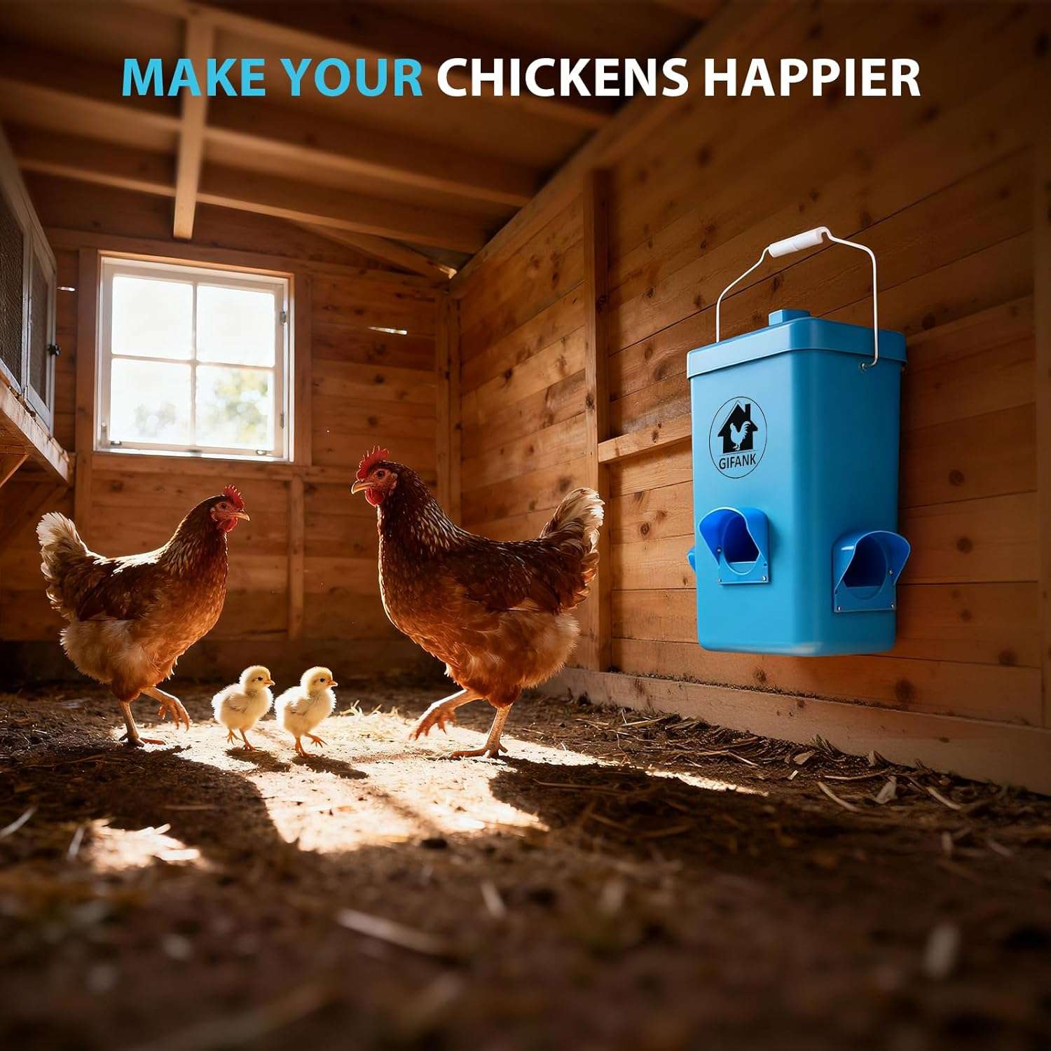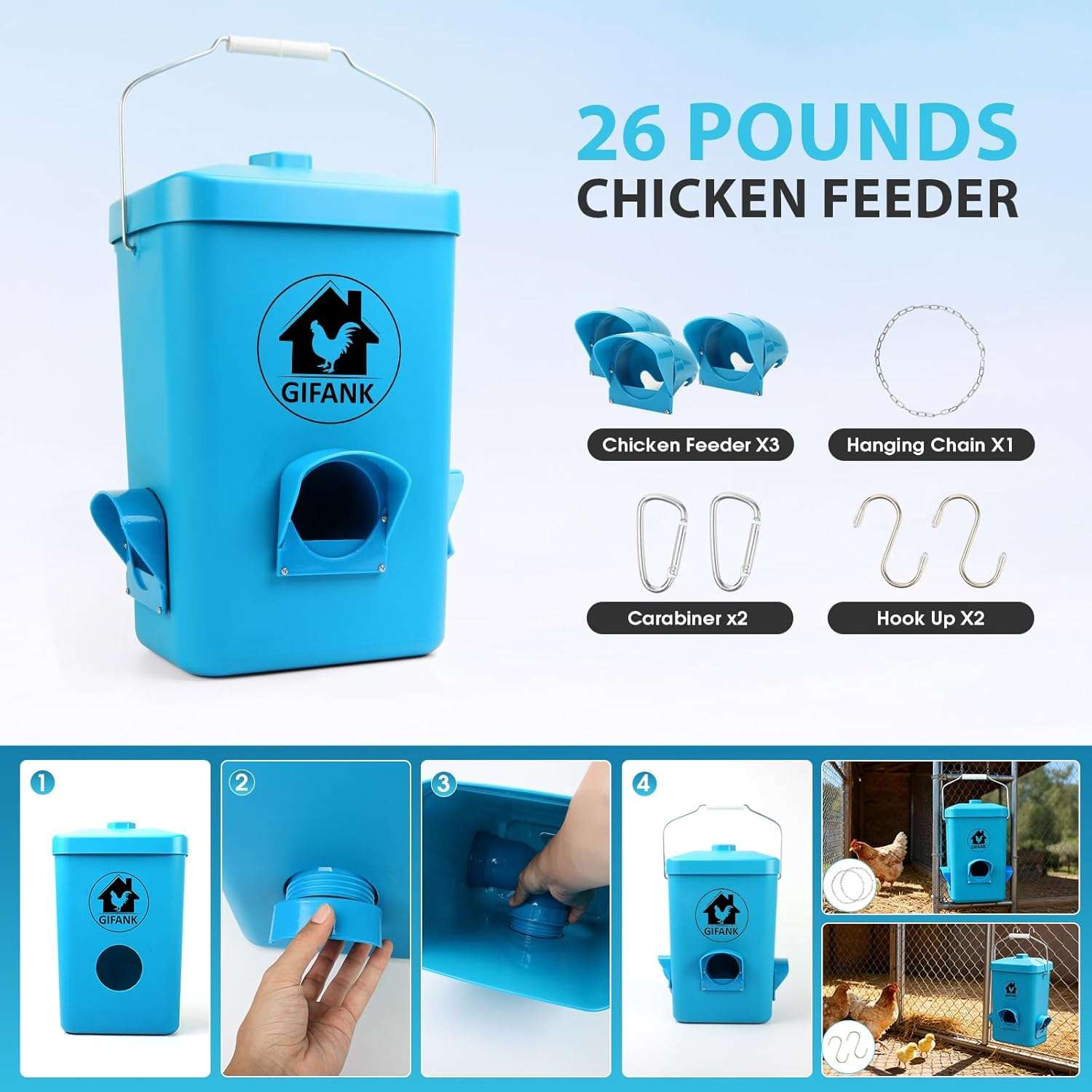 Olvídate de rellenar el comedero todos los días. Con una capacidad de 12 Kilos (26 lbs), esta tolva automática asegura que tu rebaño tenga alimento disponible por largos periodos. Sus 3 puertos de alimentación permiten que varias gallinas coman simultáneamente sin competencia, reduciendo el estrés en el gallinero.