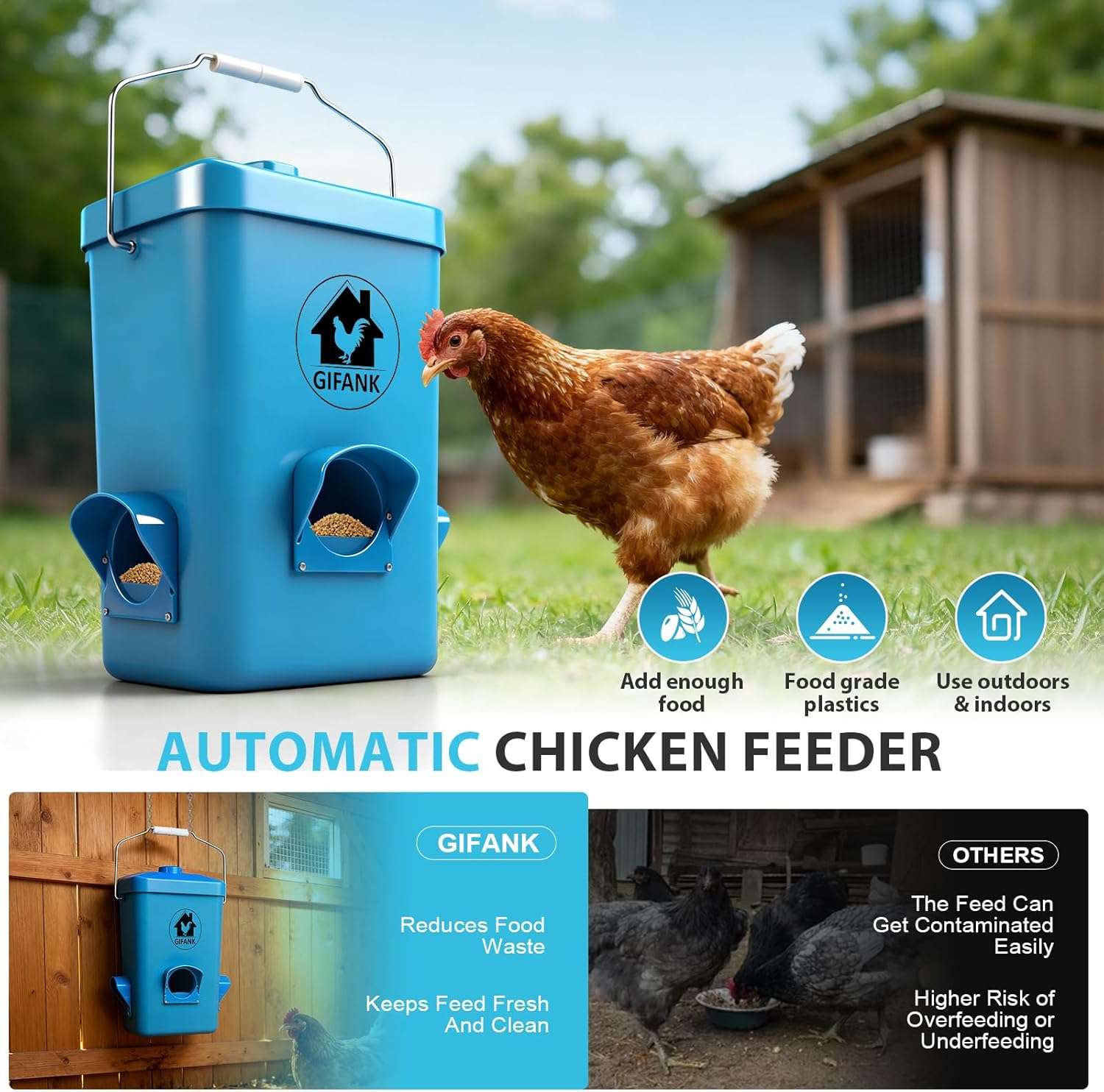 Ahorra dinero en alimento. Los puertos cuentan con deflectores actualizados que impiden que las gallinas escarben y boten el grano (Anti-Desperdicio). Además, la parte superior del comedero está ensanchada para funcionar como un paraguas, haciendo que el agua de lluvia resbale sin mojar la comida. Mantén el alimento seco y libre de hongos en cualquier clima.