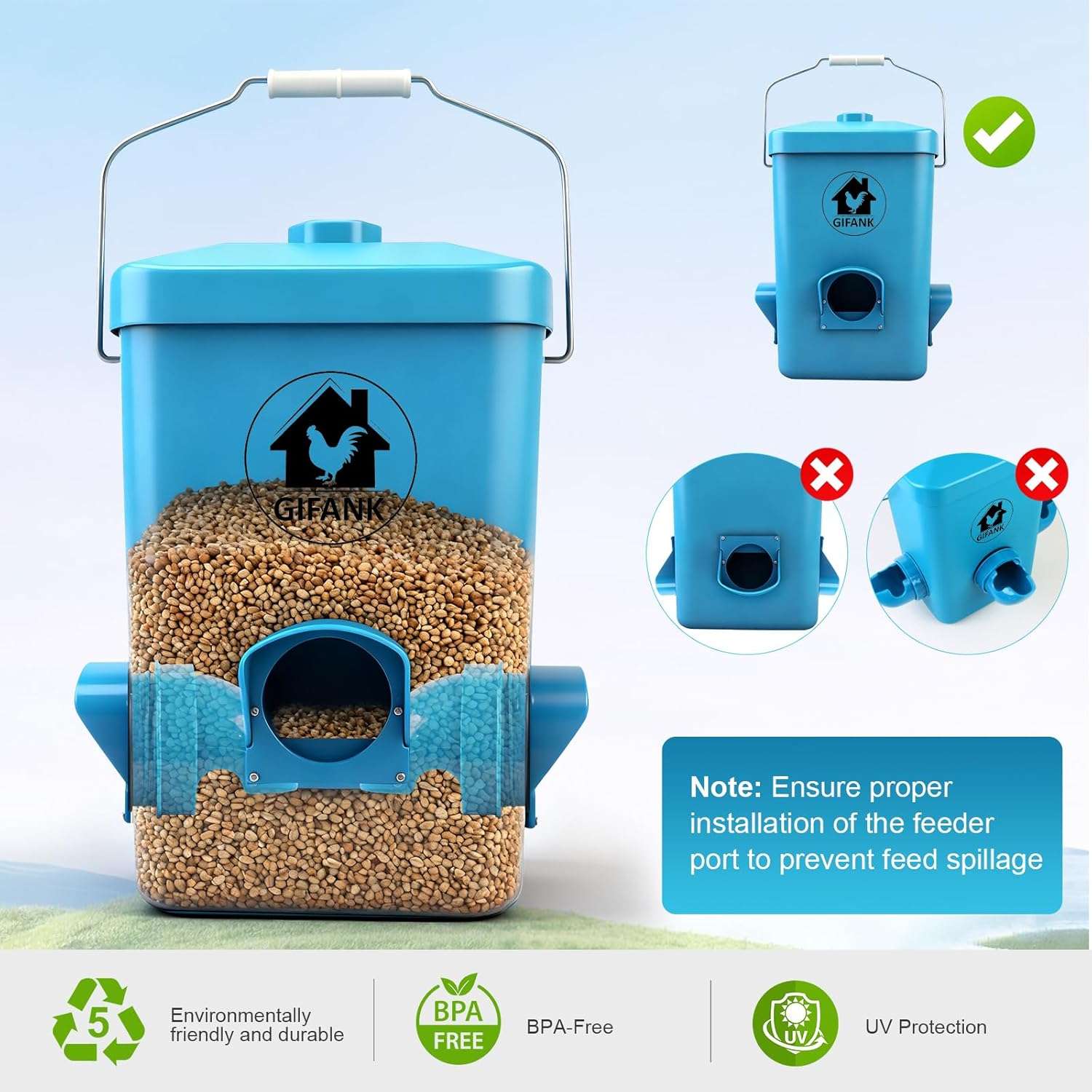 A diferencia de los comederos económicos con asas de plástico que se rompen con el sol, este modelo incluye un Mango de Acero Inoxidable reforzado. Esto te permite colgar los 12 kg de peso con total seguridad usando una cadena o gancho. El cuerpo está fabricado en plástico PP grueso, resistente a golpes y 100% Libre de BPA para cuidar la salud de tus aves.