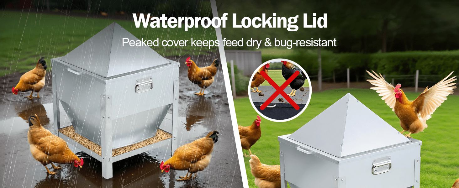 Protege tu inversión en alimento. La tapa superior cuenta con un sistema de bloqueo con pestillo que la mantiene cerrada incluso con vientos fuertes o intentos de animales curiosos (ratones/mapaches). Además, su diseño de techo inclinado o “pico” evita que las gallinas se posen encima, eliminando la suciedad y las heces sobre el comedero. Totalmente impermeable, garantiza grano seco y fresco en cualquier clima.