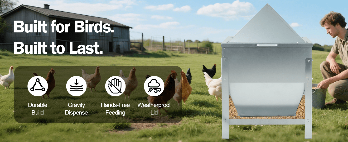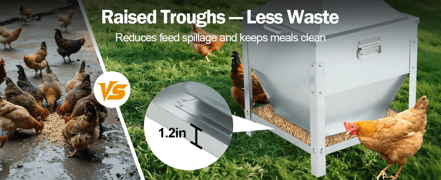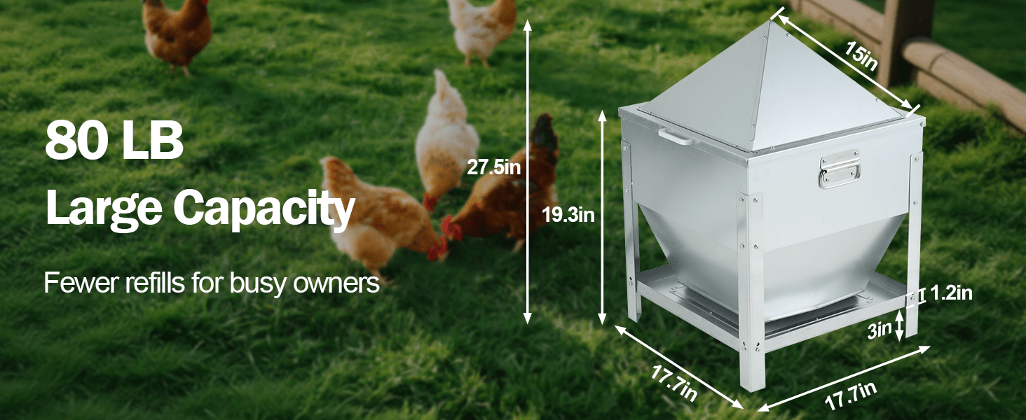 Transforma la gestión de tu criadero con este comedero de alto rendimiento. Con una capacidad masiva de 36 Kilos (80 lbs), puedes vaciar más de un saco entero de alimento y olvidarte de recargar durante semanas. Su diseño incluye patas independientes que elevan la tolva, manteniendo la comida lejos de la humedad del suelo, facilitando la limpieza debajo y colocando el alimento a la altura perfecta para la espalda de tus aves.