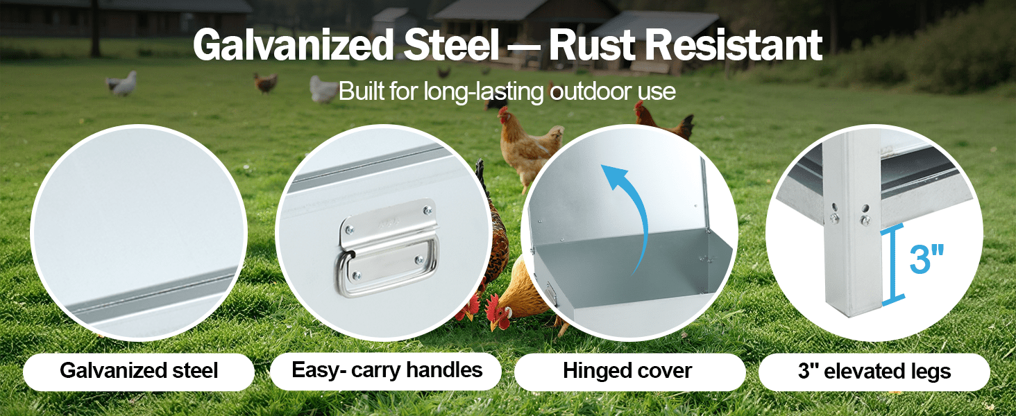Ideal para bandadas numerosas. Su diseño cuadrado abierto permite que las aves coman simultáneamente desde los 4 lados, reduciendo la competencia y el estrés en el gallinero. Las paredes del plato son altas para evitar que las gallinas escarben hacia afuera, actuando como un sistema Anti-Desperdicio que mantiene el suelo limpio y tu bolsillo contento. Fabricado en acero galvanizado de alta resistencia, es un equipo para toda la vida.