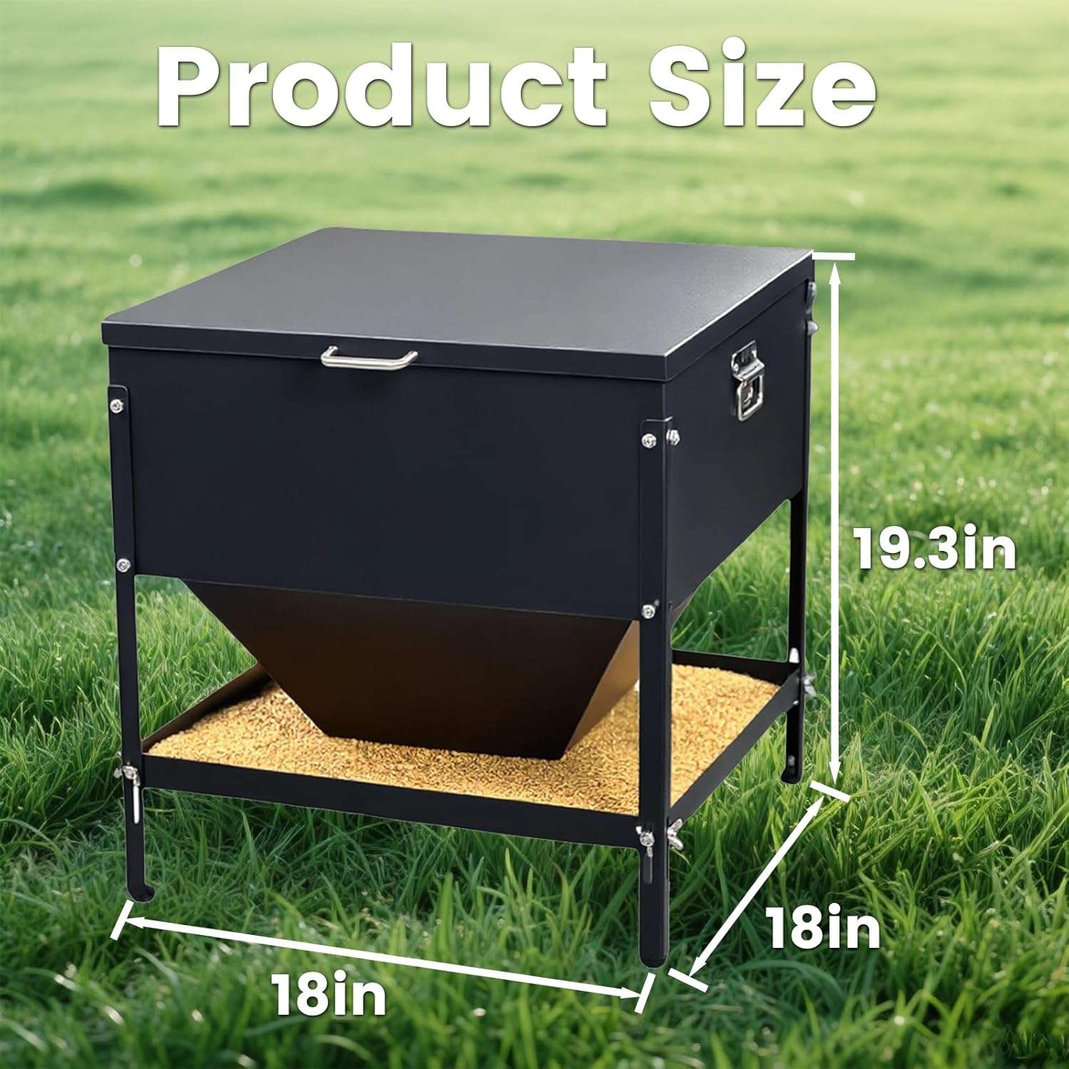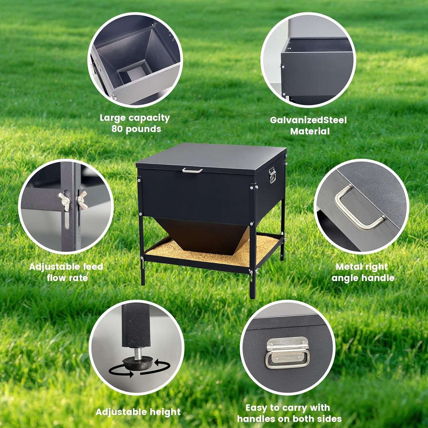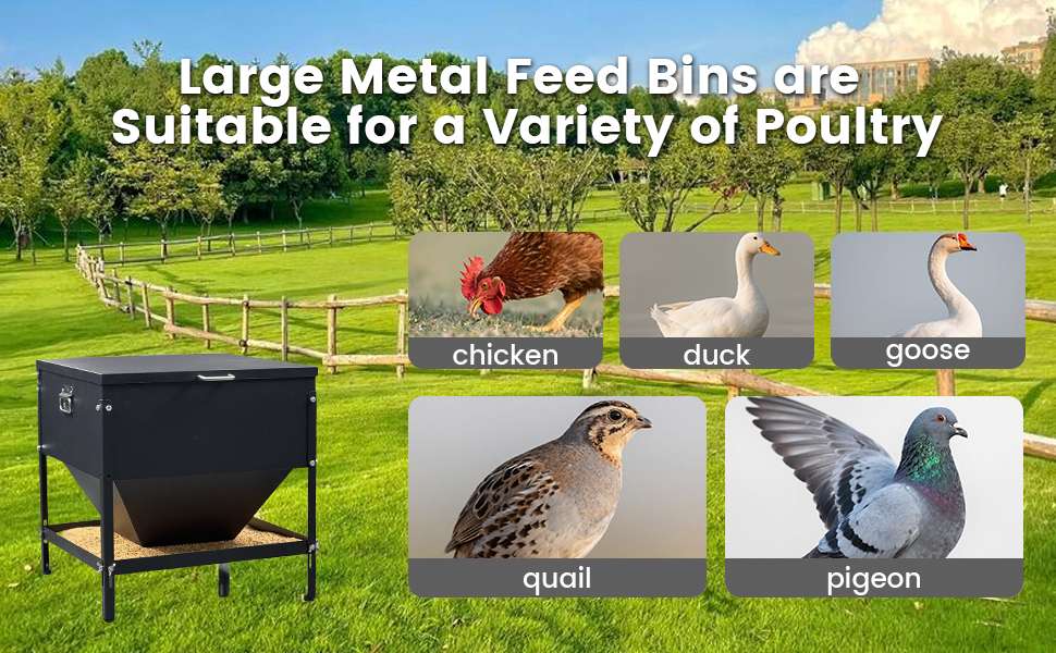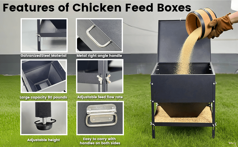 Control total sobre el gasto de alimento. Este sistema permite regular el caudal de salida del grano, asegurando una alimentación precisa y evitando que se derrame exceso de comida en la bandeja (Sistema Anti-Desperdicio). Cuenta con una tapa impermeable que protege el tanque principal de la lluvia y un asa robusta para facilitar su transporte. Nota: Para uso en exteriores bajo lluvia intensa, se recomienda colocarlo bajo techo para proteger la bandeja inferior.