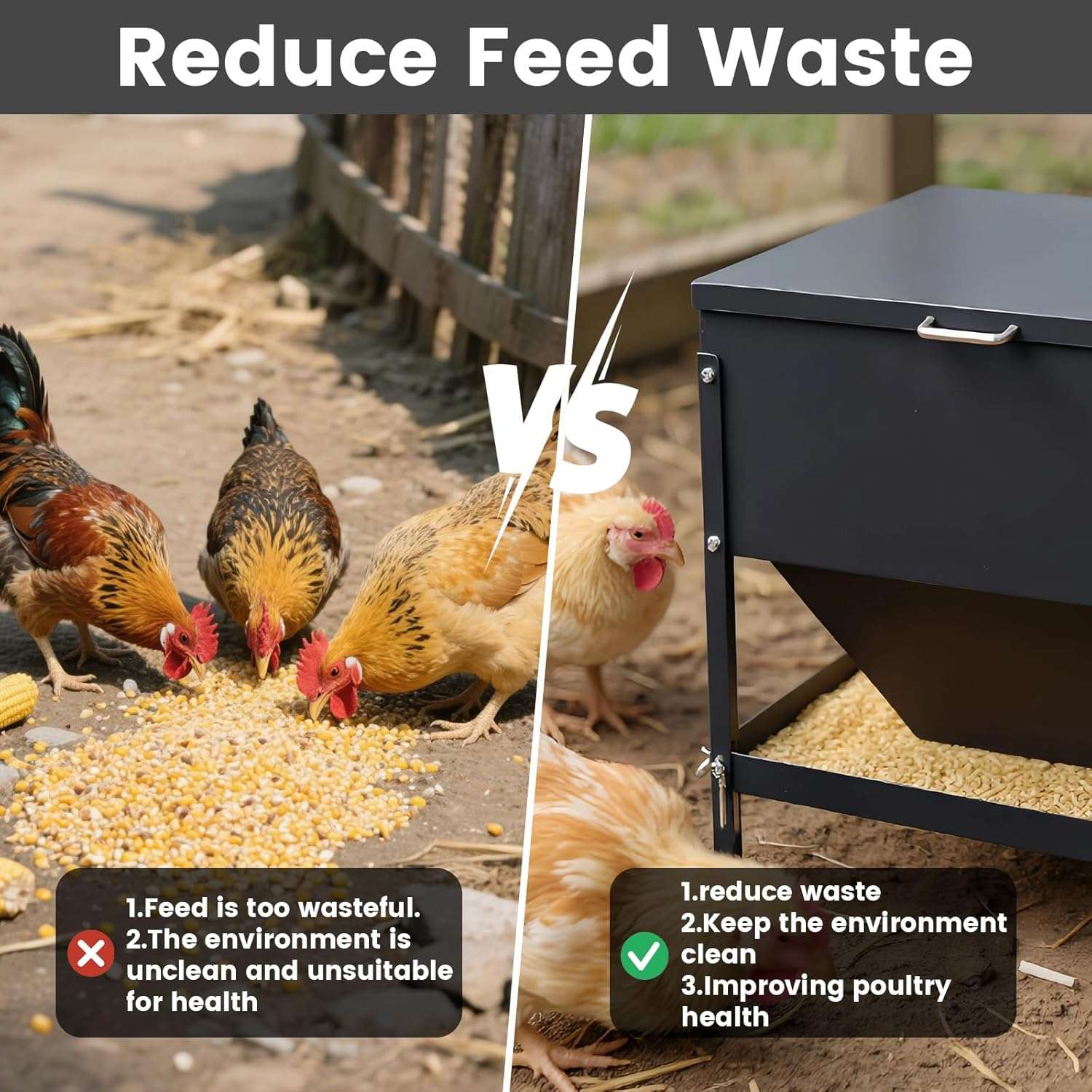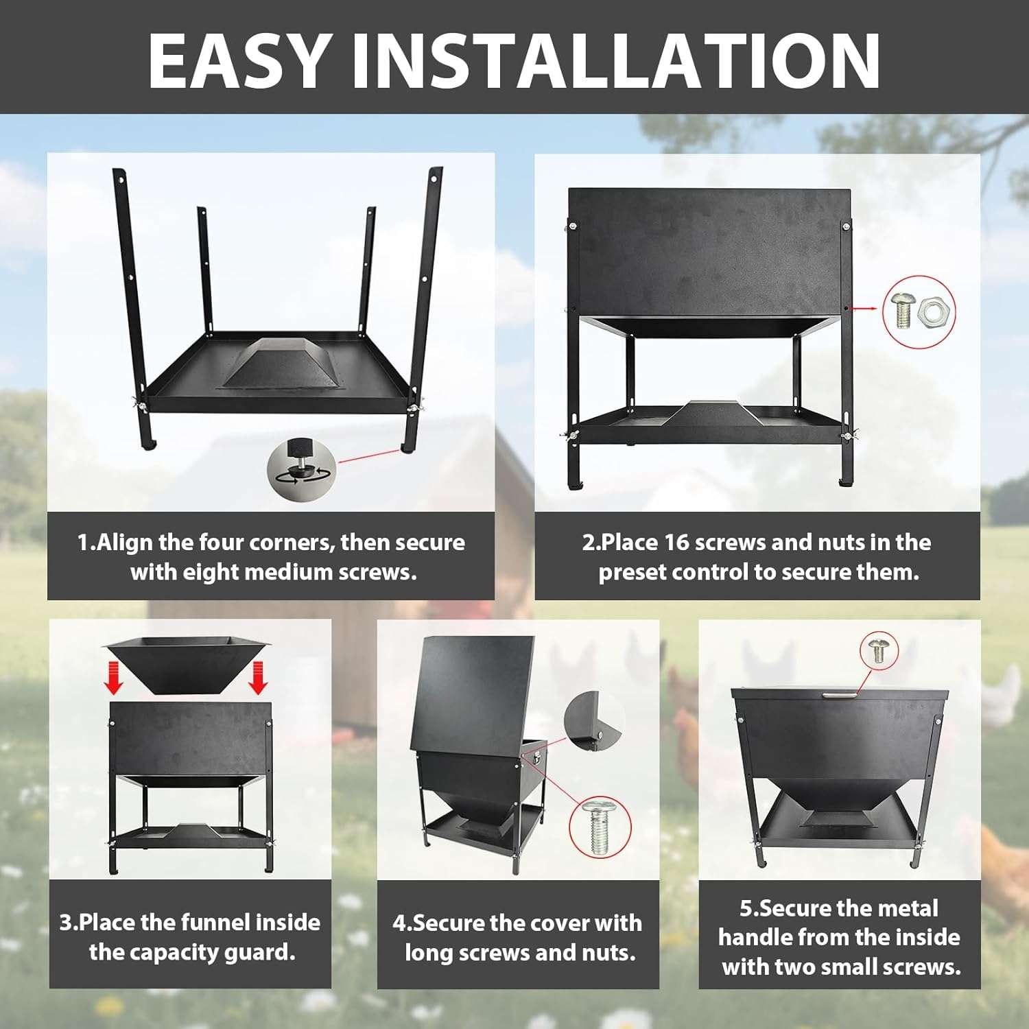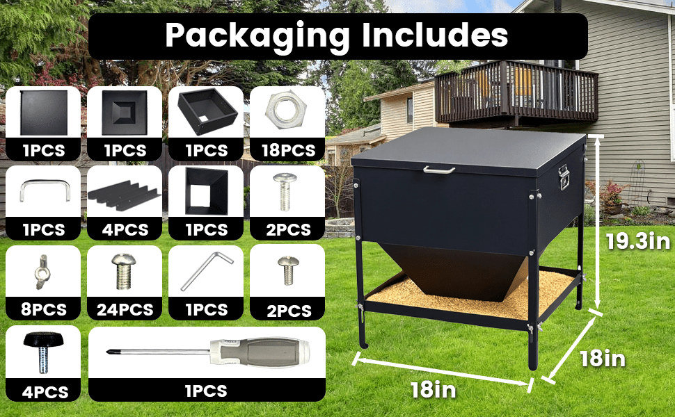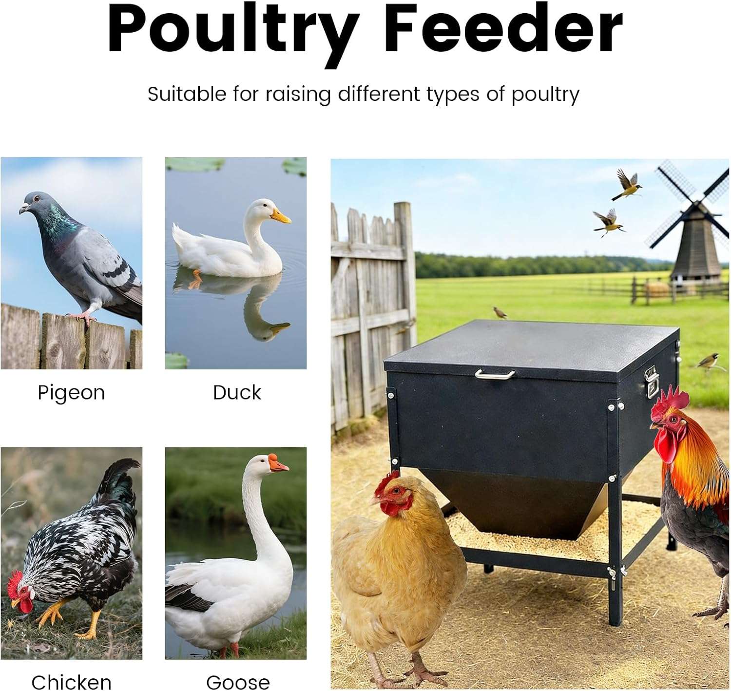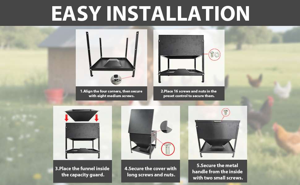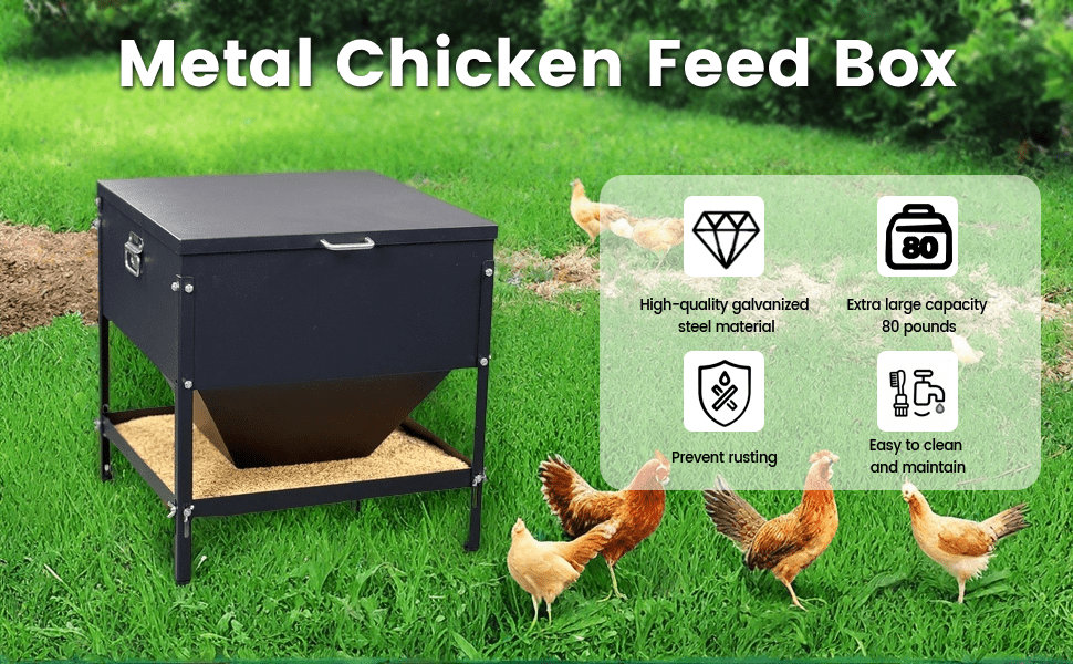 Fabricado en acero galvanizado resistente al óxido, este comedero está construido para durar años soportando el clima y el desgaste diario. Su diseño cuadrado permite la alimentación simultánea desde los 4 lados, acomodando cómodamente a 16 pollos o gallinas a la vez. Esto reduce el estrés en el gallinero, evita peleas por la comida y permite que todo el rebaño se alimente al mismo tiempo.