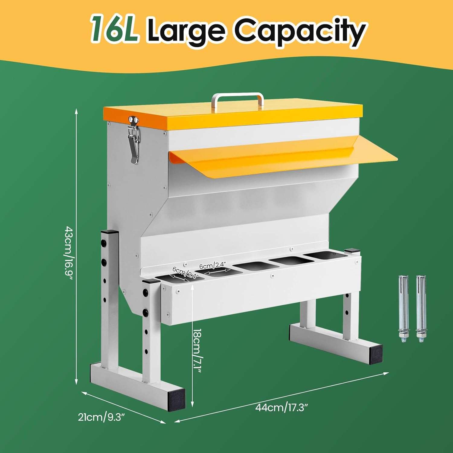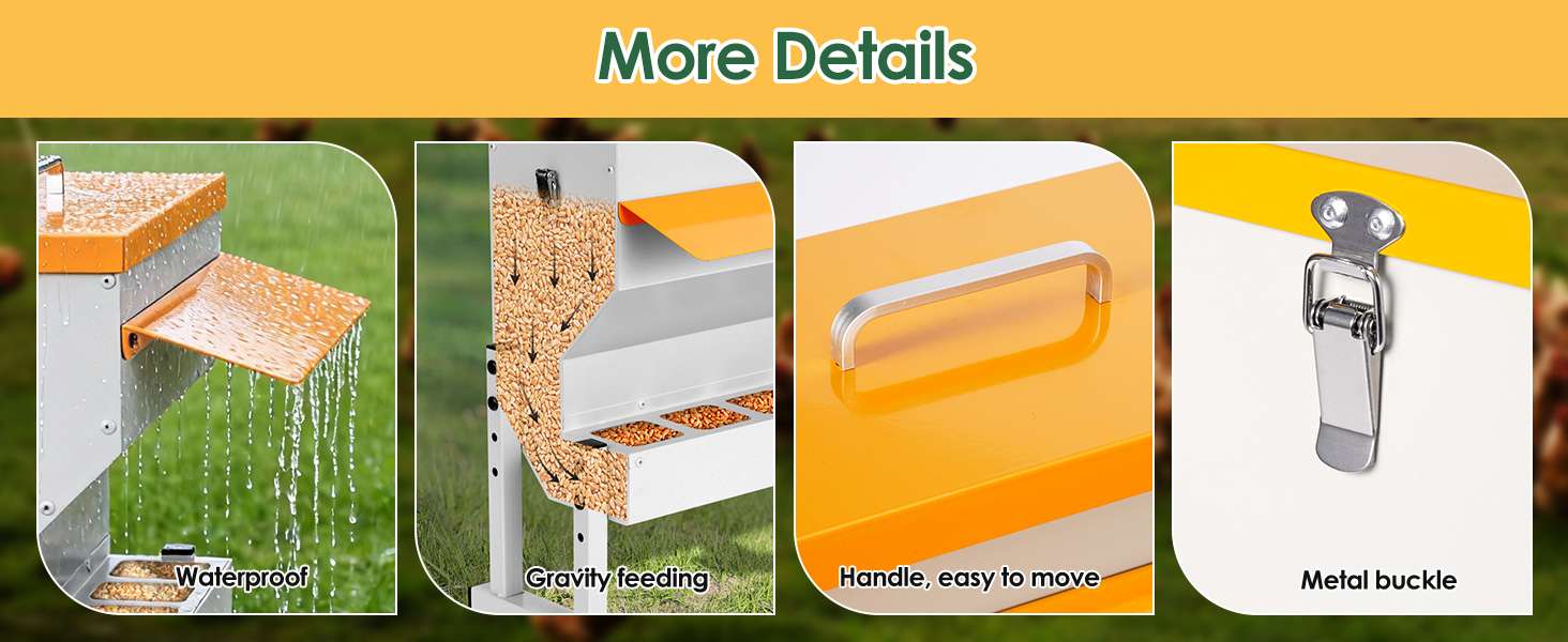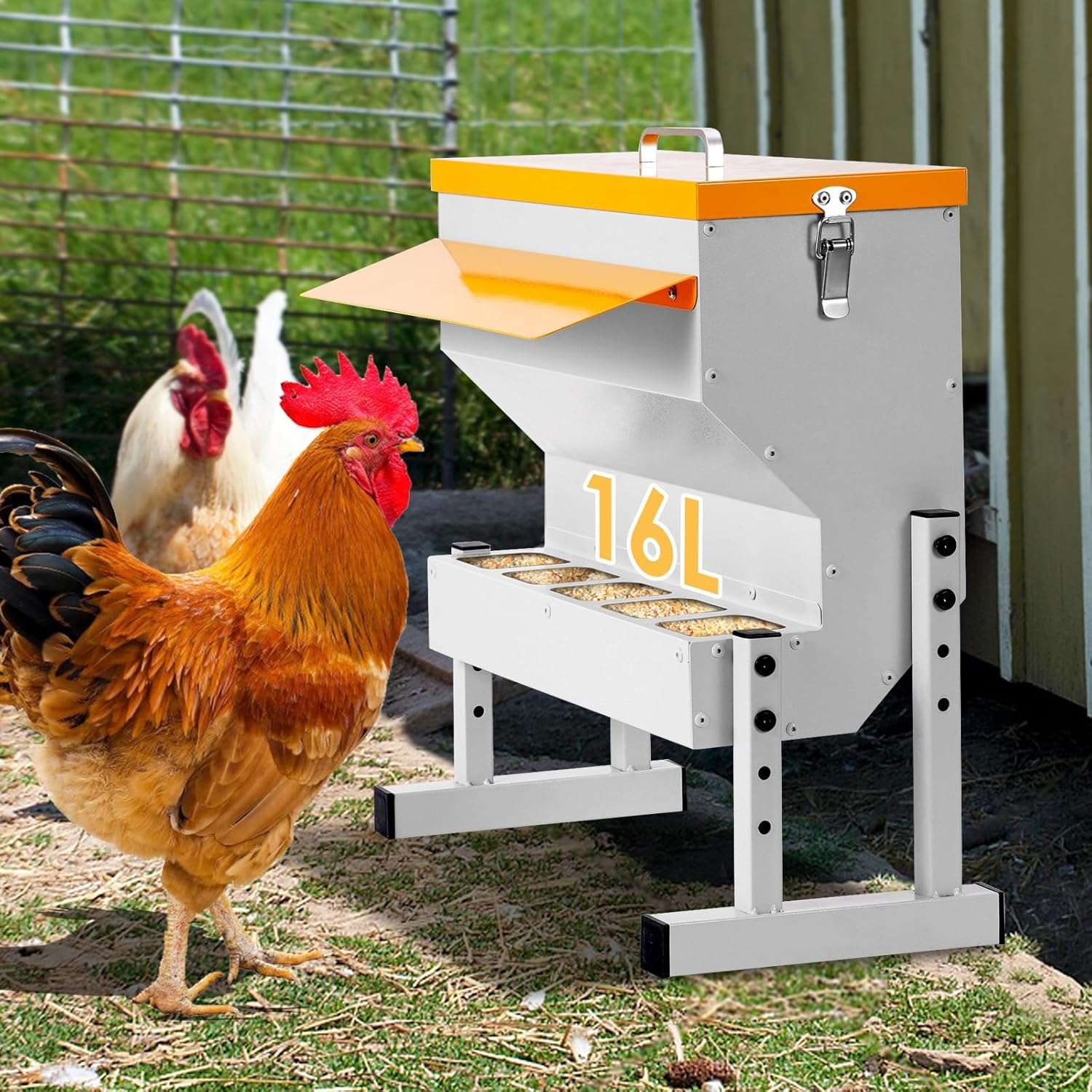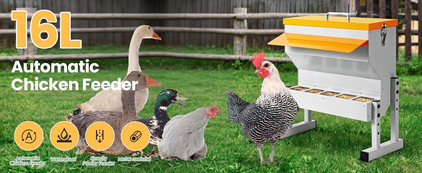 Diseñado para durar y resistir. Este comedero automático de 9 Kg (20 lbs / 16 Litros) está construido en metal robusto, soportando picoteos constantes y el uso rudo en exteriores. Su amplia capacidad te permite mantener alimentado a tu rebaño por varios días sin recargas constantes. Es la solución “Todo en Uno” ideal para bandadas mixtas de gallinas, patos, gansos y gallinas de guinea.
