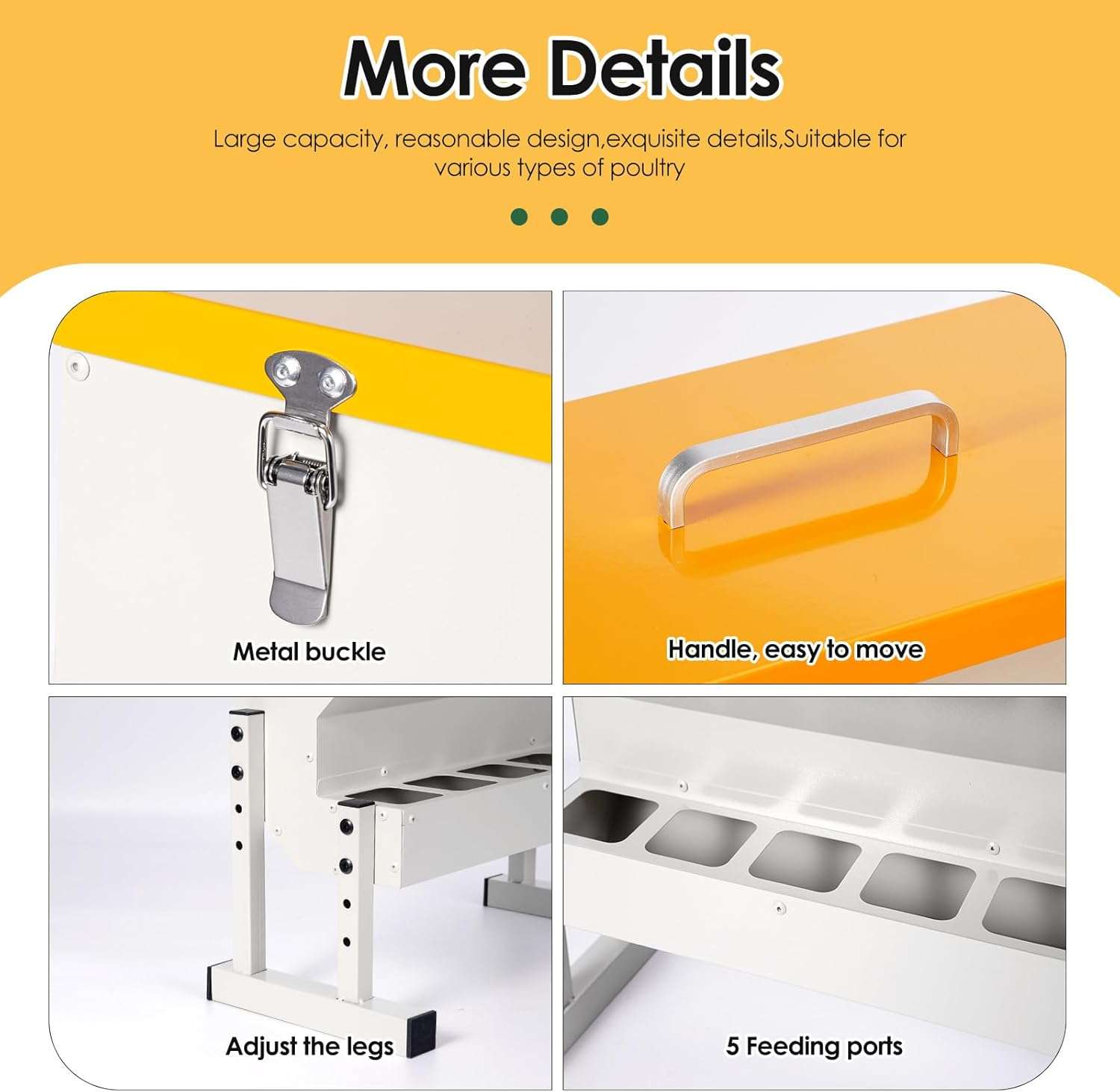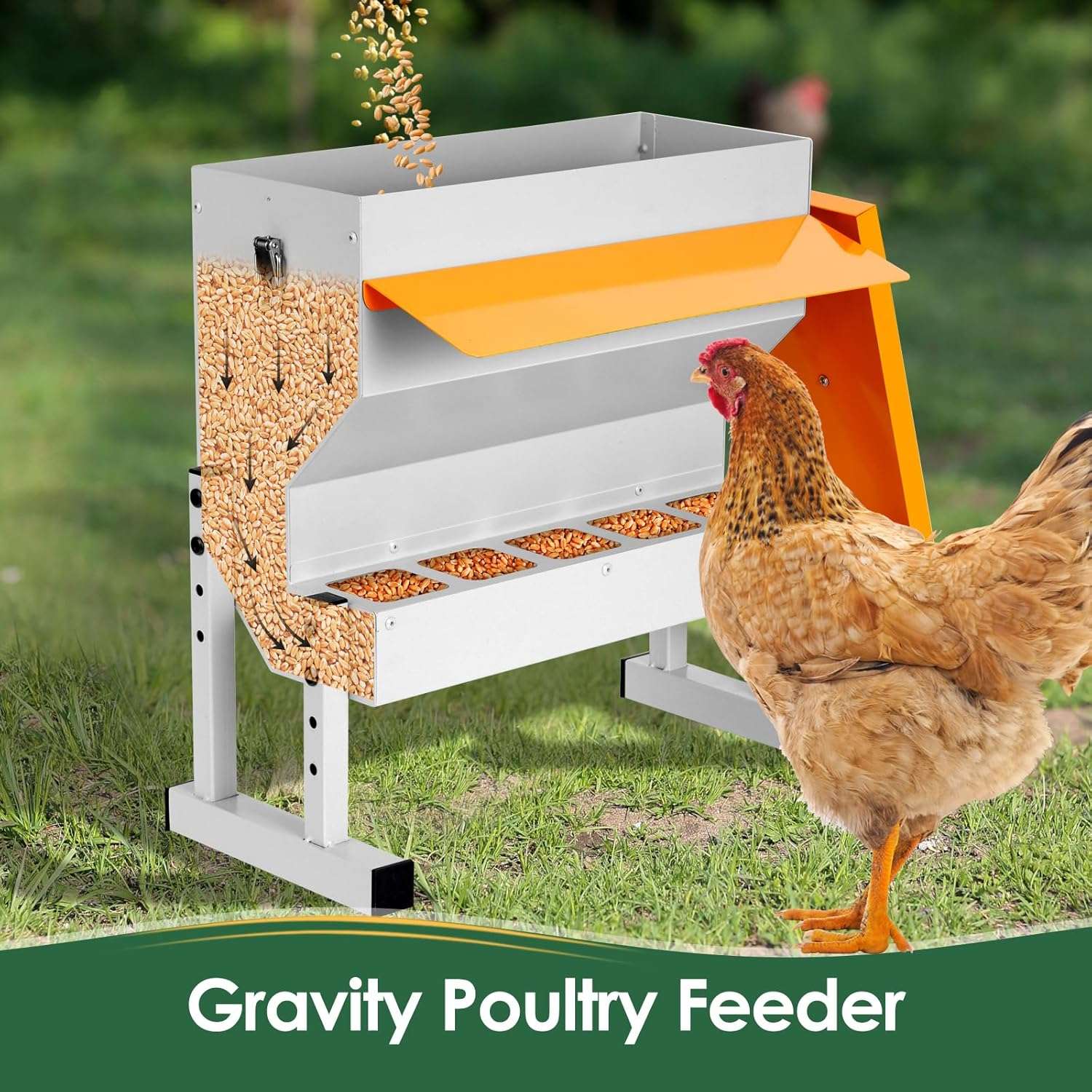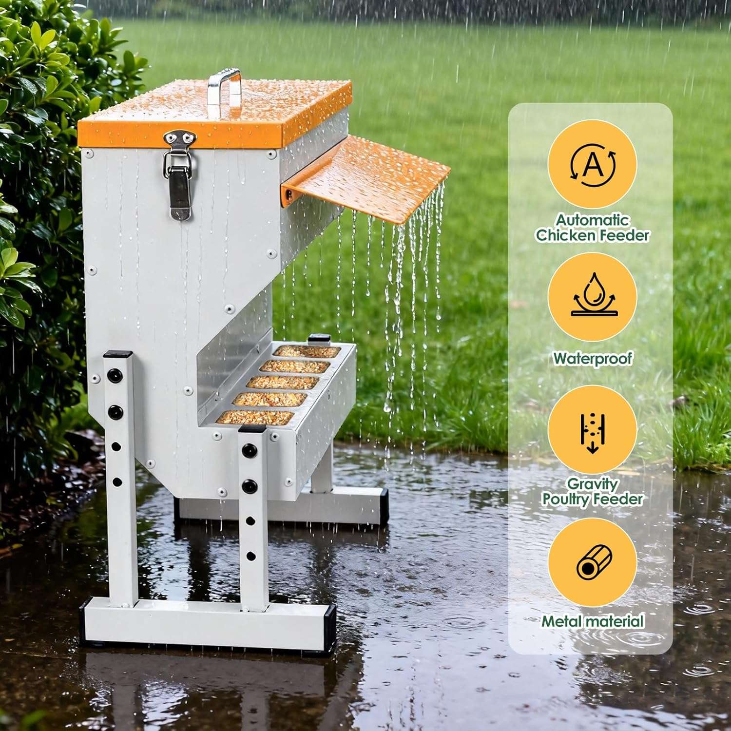 Diseñado para durar y resistir. Este comedero automático de 9 Kg (20 lbs / 16 Litros) está construido en metal robusto, soportando picoteos constantes y el uso rudo en exteriores. Su amplia capacidad te permite mantener alimentado a tu rebaño por varios días sin recargas constantes. Es la solución “Todo en Uno” ideal para bandadas mixtas de gallinas, patos, gansos y gallinas de guinea.