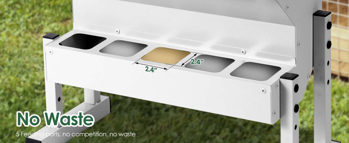 Evita las peleas por comida. Cuenta con 5 puertos de alimentación separados que permiten que múltiples aves coman simultáneamente de forma organizada. El diseño de los puertos minimiza el desperdicio al impedir que las aves escarben la comida hacia afuera. Además, incluye una cubierta de lluvia extendida (aprox. 15 cm de alero) que protege la bandeja, manteniendo el grano seco incluso bajo el clima lluvioso del sur.