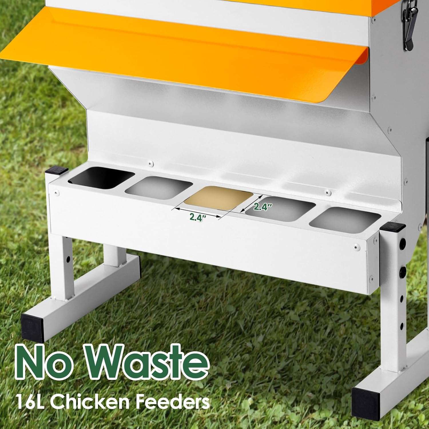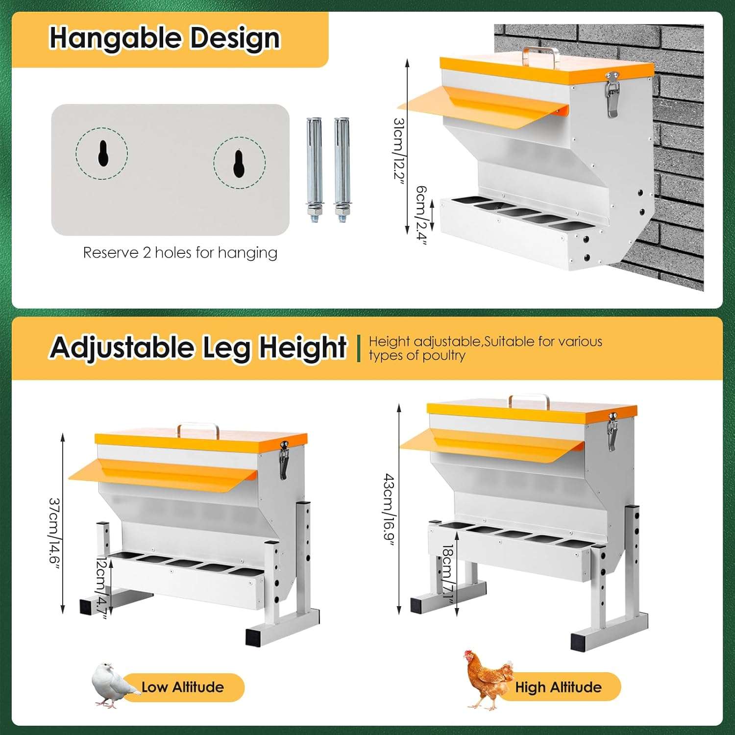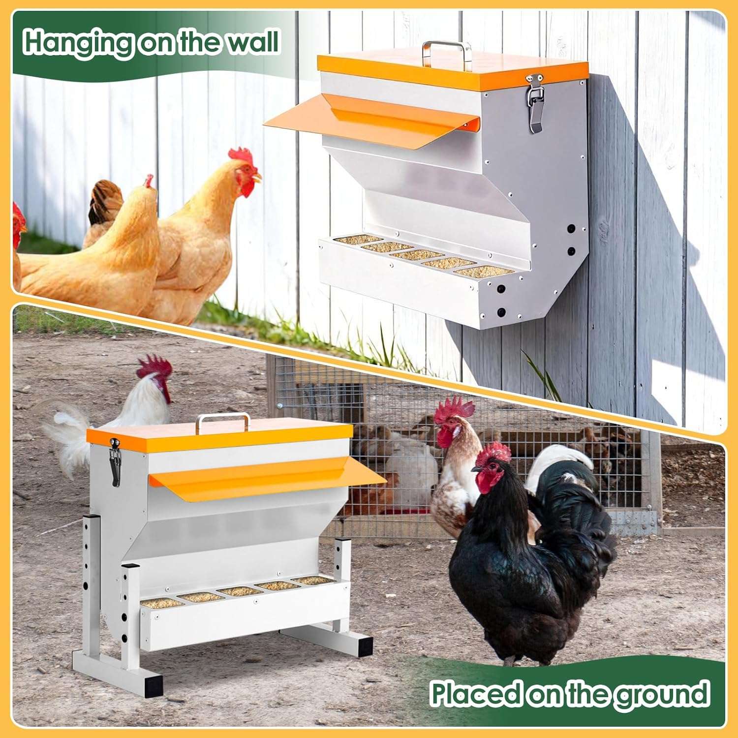 En Muro: Puedes quitar las patas y montarlo directamente en la pared o poste del gallinero. Ambas opciones mantienen el alimento limpio, libre de tierra y heces.