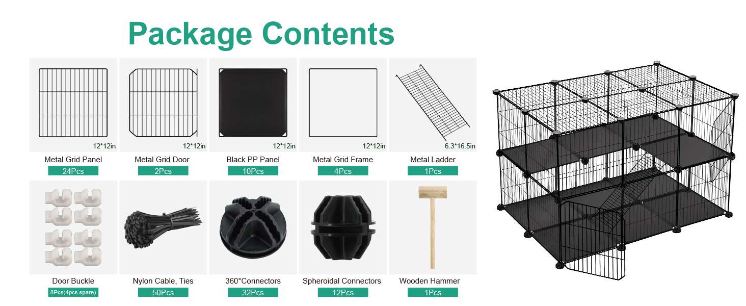 Fácil de montar: sin configuraciones complicadas. Nuestra pequeña jaula para conejo cuenta con conectores ABS actualizados, bridas de cremallera, hebillas de puerta y martillo de madera, que pueden añadir seguridad adicional, asegurando un reino seguro y acogedor para los amigos de mascotas. Las dimensiones de cada panel/malla son de 11.8 x 11.8 pulgadas, el tamaño recomendado de la forma ensamblada puede ser de 35.4 pulgadas de largo x 23.6 pulgadas de ancho x 23.6 pulgadas de alto.