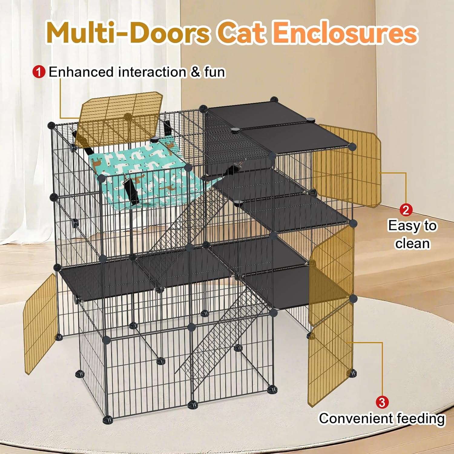 Diseño de varias puertas: nuestro corralito para gatos proporciona 5 puertas. Puedes montar las puertas en diferentes lugares de esta jaula para gatos, lo que sería muy conveniente para interactuar con tu mascota, alimentar, limpiar las jaulas para gatos en interiores y fácil acceso para los animales pequeños.