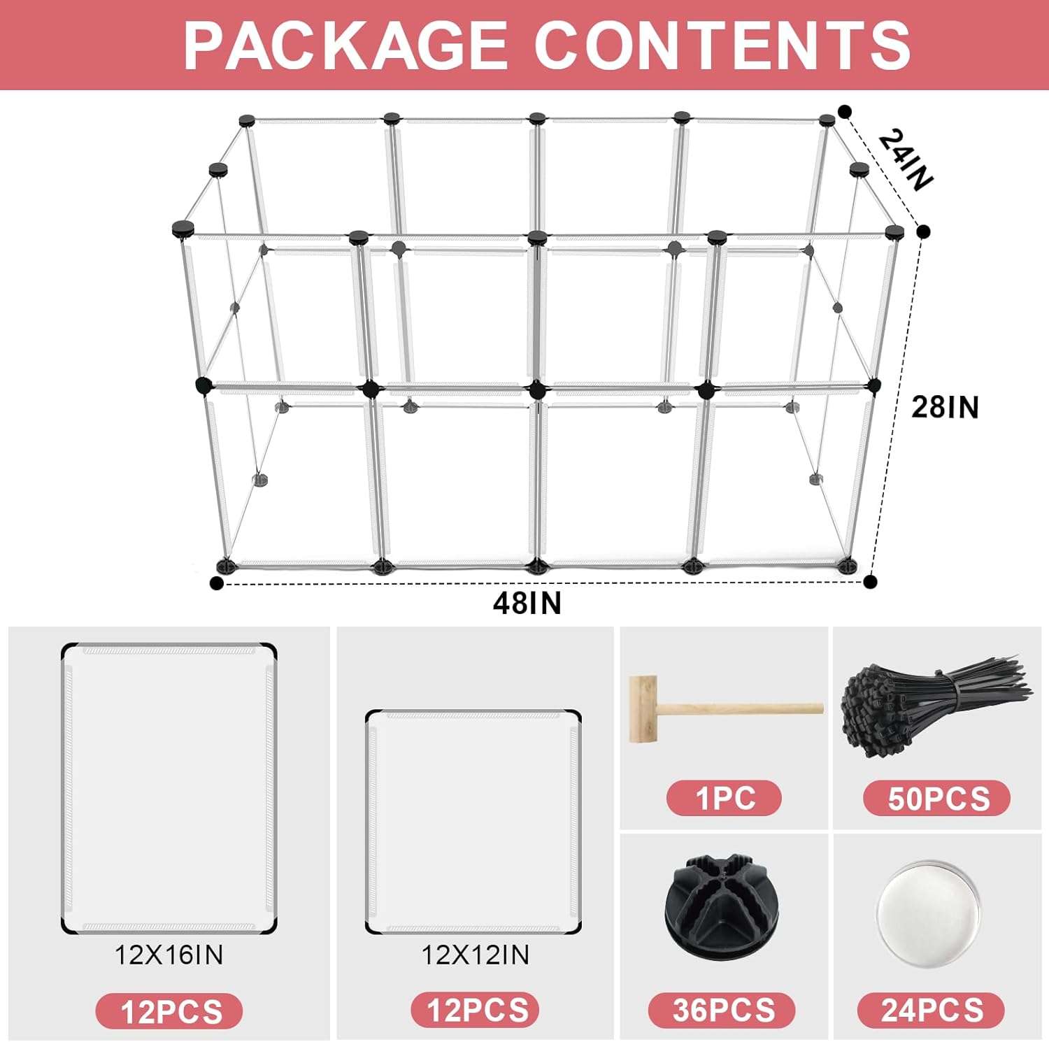Paquete de corralito para mascotas: cada juego incluye 24 paneles transparentes, 50 bridas de nailon, 36 conectores, 24 tapetes antideslizantes, 1 martillo de madera, 1 manual de usuario (idioma español no garantizado). Este pequeño corralito para animales ofrece un área espaciosa y segura para que tus amigos peludos jueguen y hagan ejercicio. El tamaño montado puede ser de 121.9 x 60.9 x 71 cm.