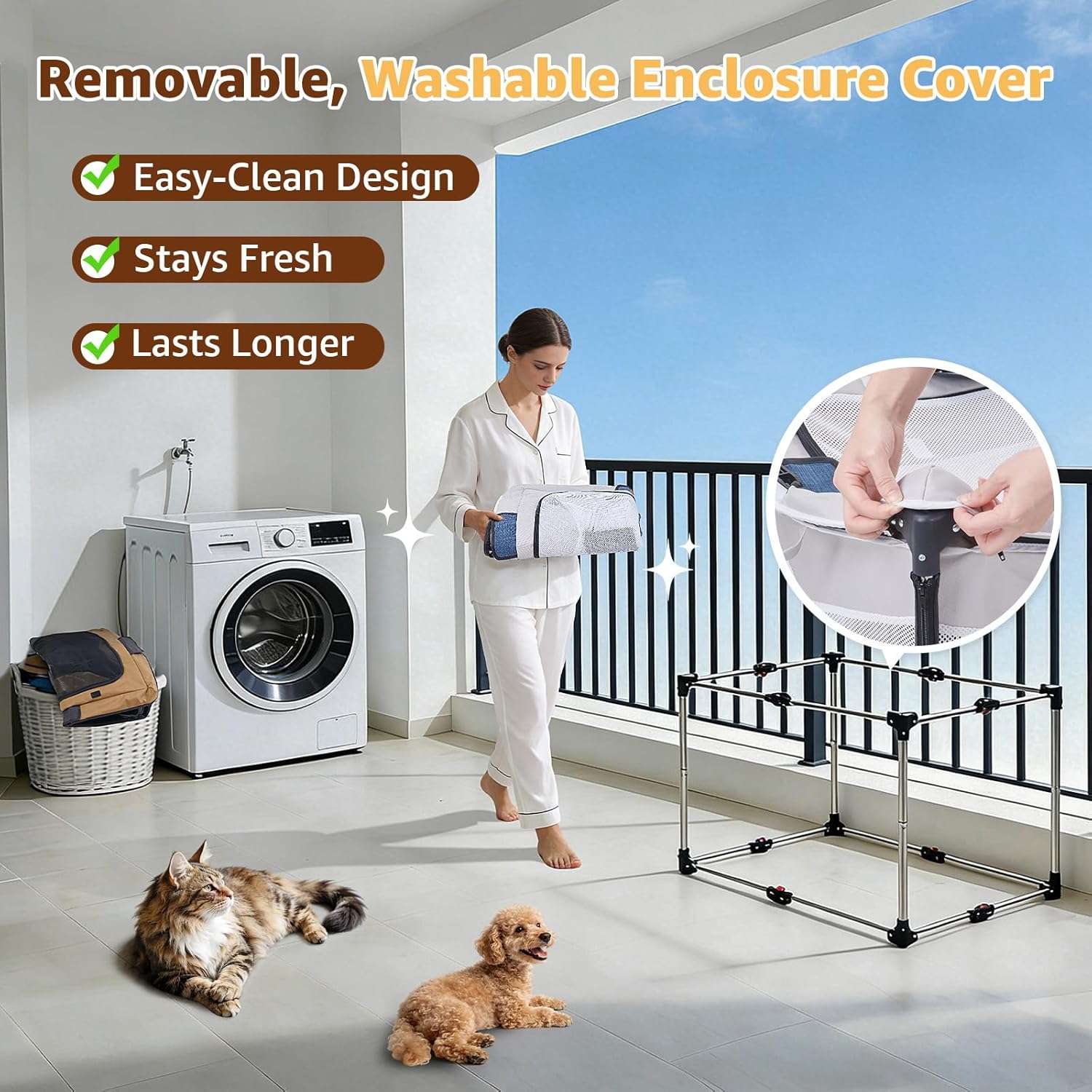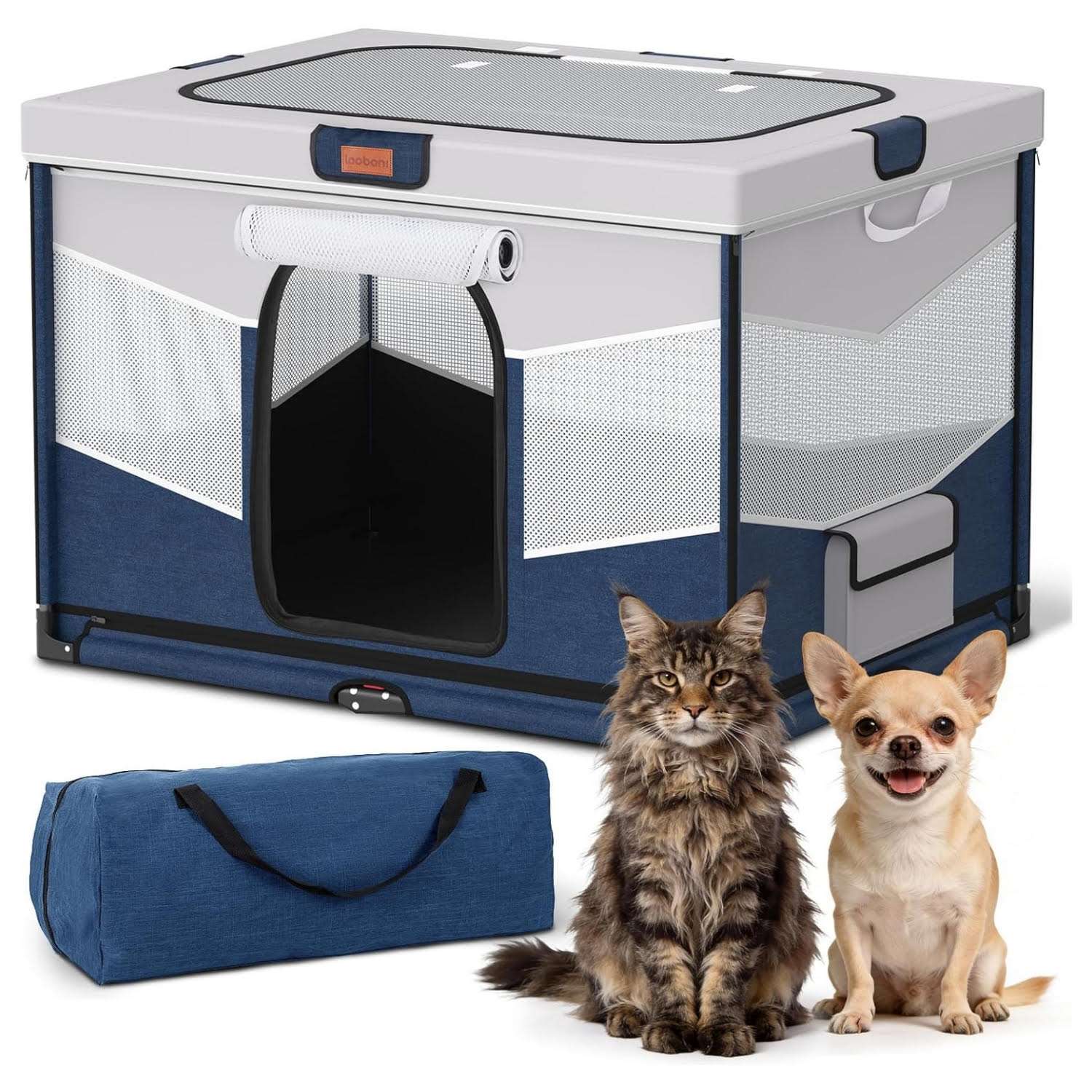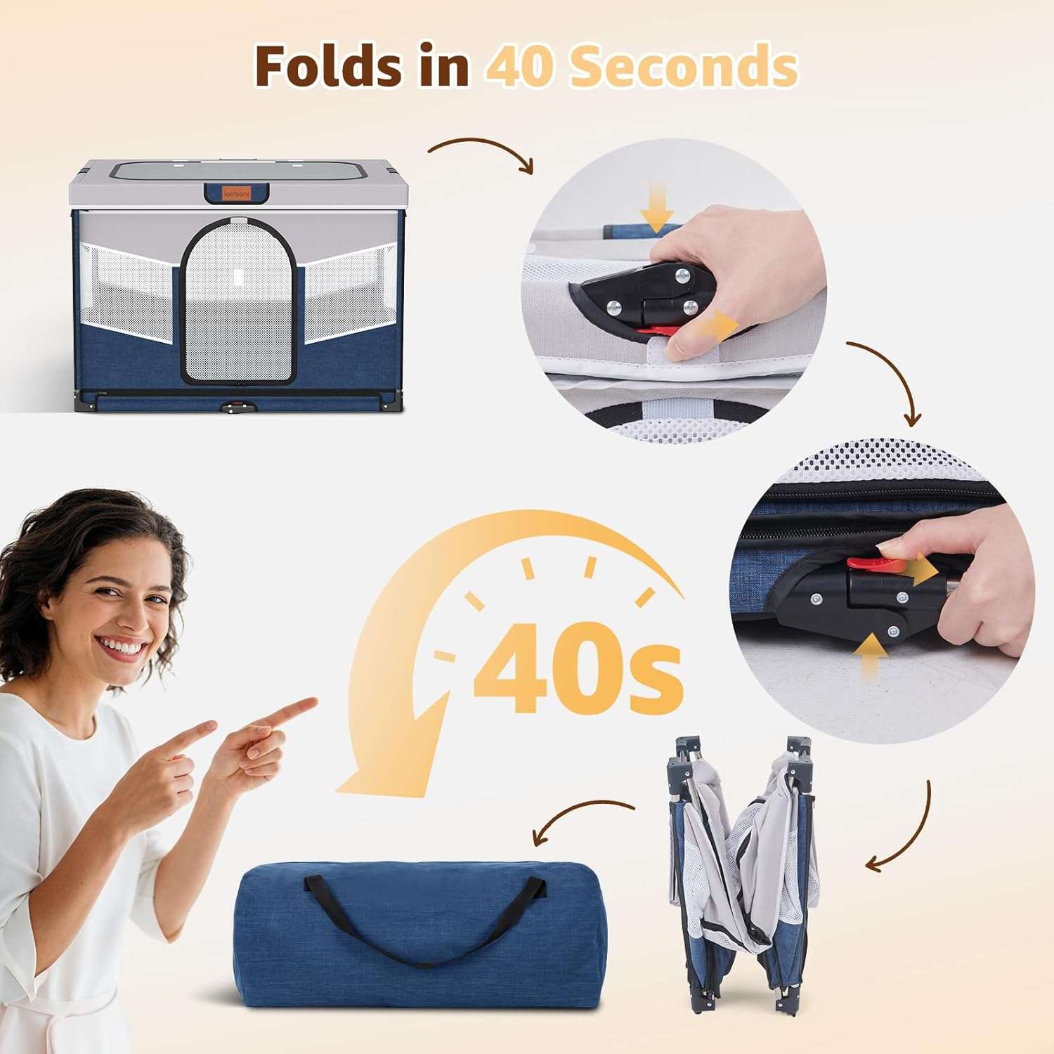 El montaje es sumamente rapido ya que se instala y se pliega en menos de 40 segundos sin necesidad de desarmar piezas Todo el corral cuenta con paneles de malla transpirable de alta densidad en 360 grados garantizando un flujo de aire constante para mantener a su mascota fresca y tranquila Ademas los tubos interiores estan suavemente acolchados para evitar el contacto con marcos duros creando un espacio muy comodo para el descanso y se incluye una elegante bolsa de transporte con textura de mezclilla ideal para viajes campamentos o paseos