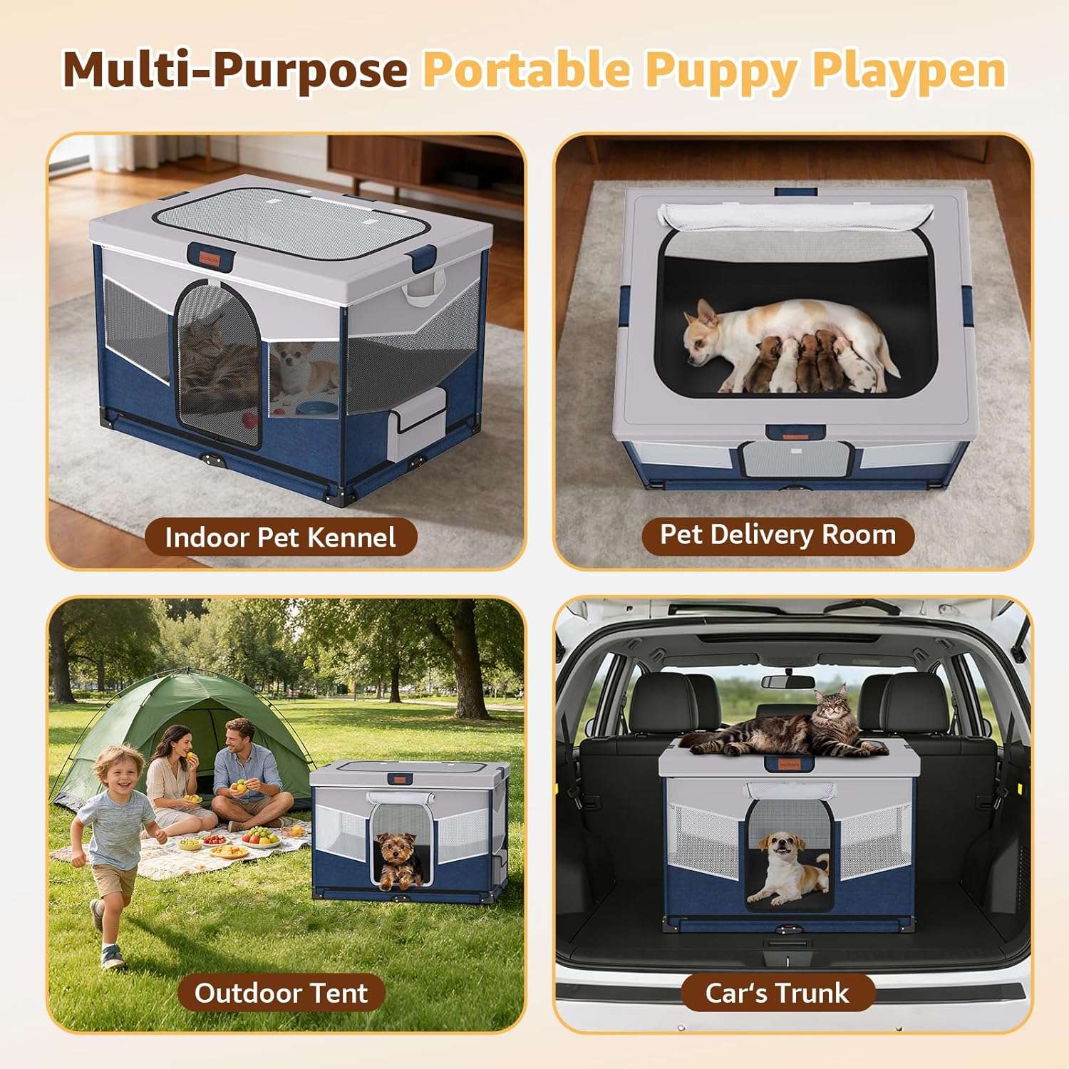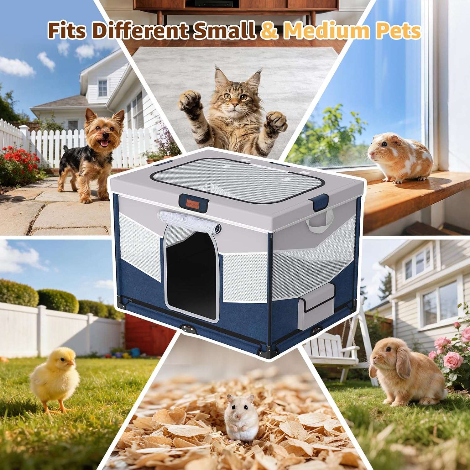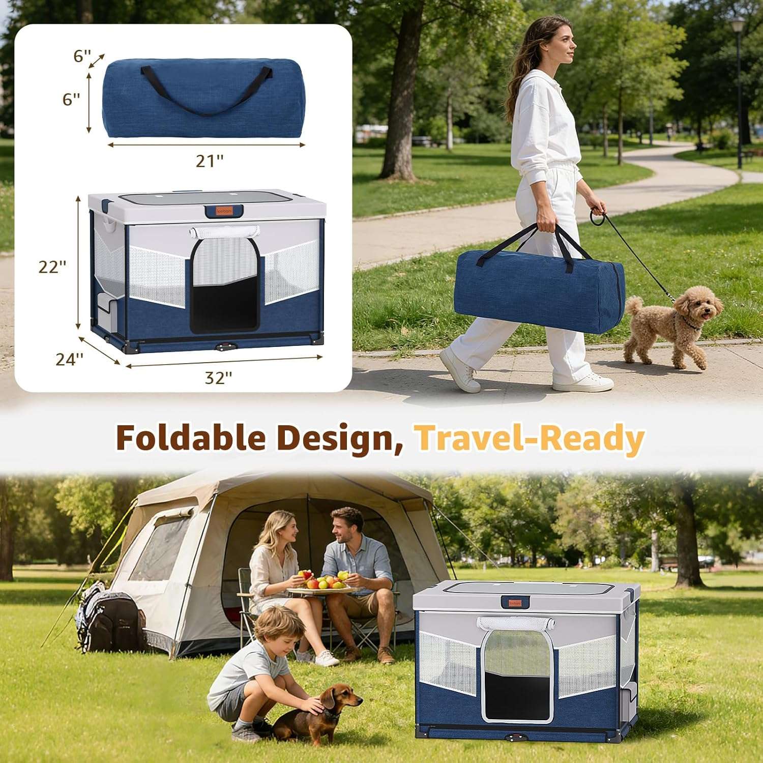 El montaje es sumamente rapido ya que se instala y se pliega en menos de 40 segundos sin necesidad de desarmar piezas Todo el corral cuenta con paneles de malla transpirable de alta densidad en 360 grados garantizando un flujo de aire constante para mantener a su mascota fresca y tranquila Ademas los tubos interiores estan suavemente acolchados para evitar el contacto con marcos duros creando un espacio muy comodo para el descanso y se incluye una elegante bolsa de transporte con textura de mezclilla ideal para viajes campamentos o paseos
