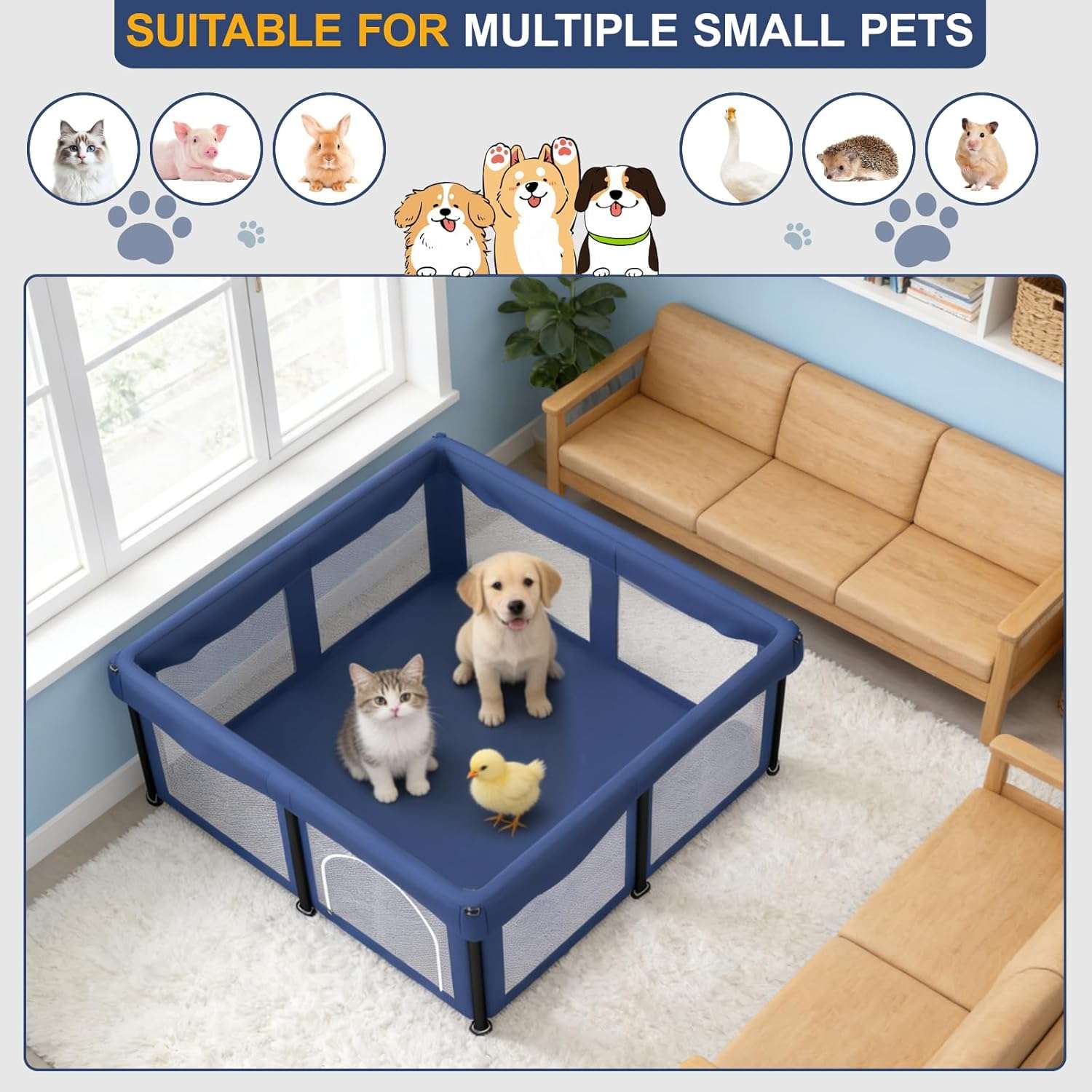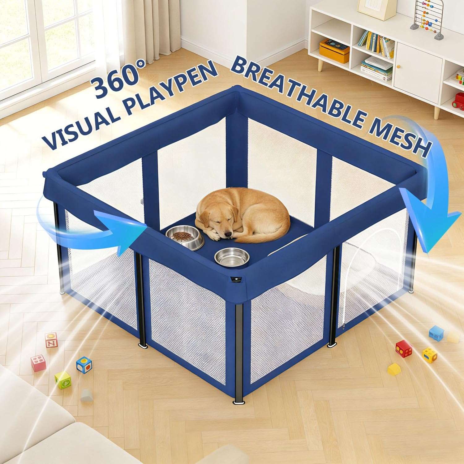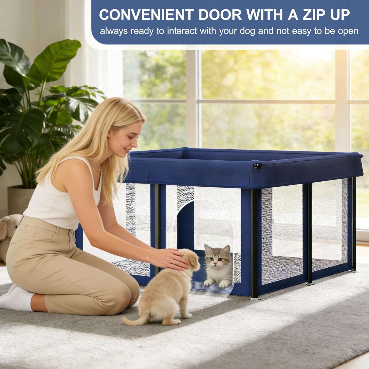 Cuenta con un diseño sin techo que crea un ambiente espacioso y transpirable para su mascota al tiempo que le permite interactuar o sacarla con gran facilidad La tela de malla de alta transparencia ubicada en los cuatro lados garantiza una observacion clara y un monitoreo en tiempo real Ademas incluye una puerta independiente con cremallera que permite a las mascotas entrar y salir libremente reduciendo eficazmente la ansiedad cuando se quedan solas en casa