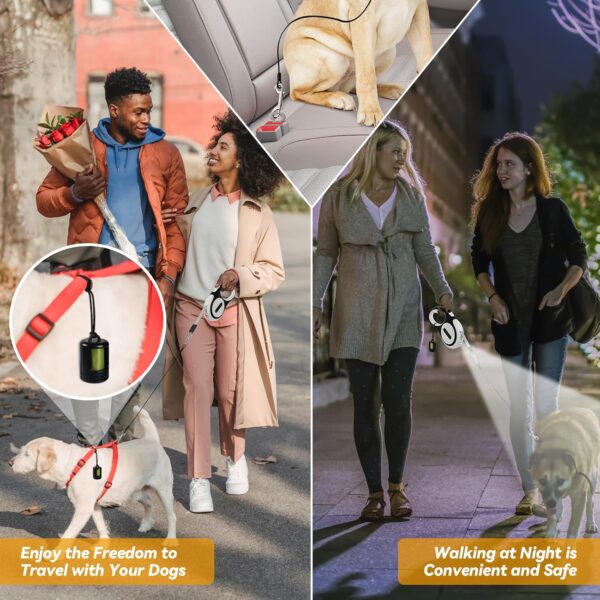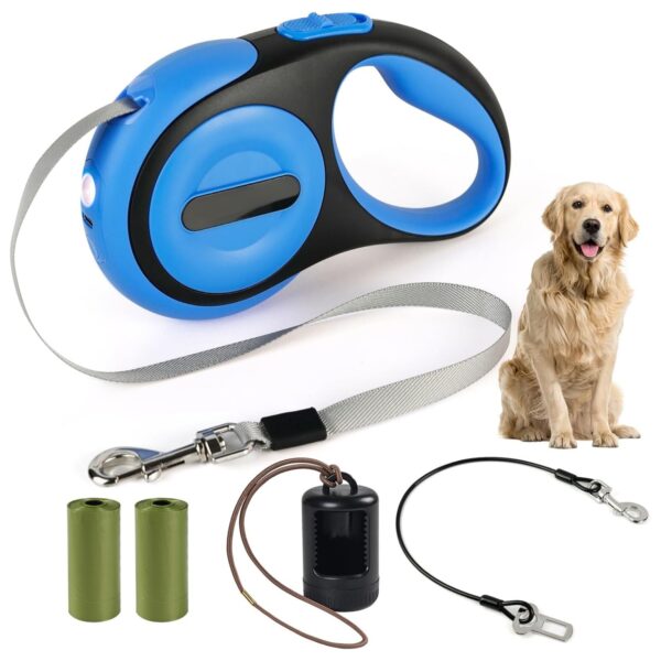 Combinación perfecta 6 en 1 : esta correa retráctil para perro se ha actualizado a una configuración 6 en 1, equipada con una luz LED, 2 bolsas de excremento y dispensadores, cable de acero antimasticación de 21.5 x 2 pulgadas, diseño integrado que hace que sea fácil de transportar. Si tienes un perro al que le gusta masticar, conecta el cable de acero antimasticable en la parte delantera de la correa, lo que puede resolver perfectamente el riesgo de ser mordido.