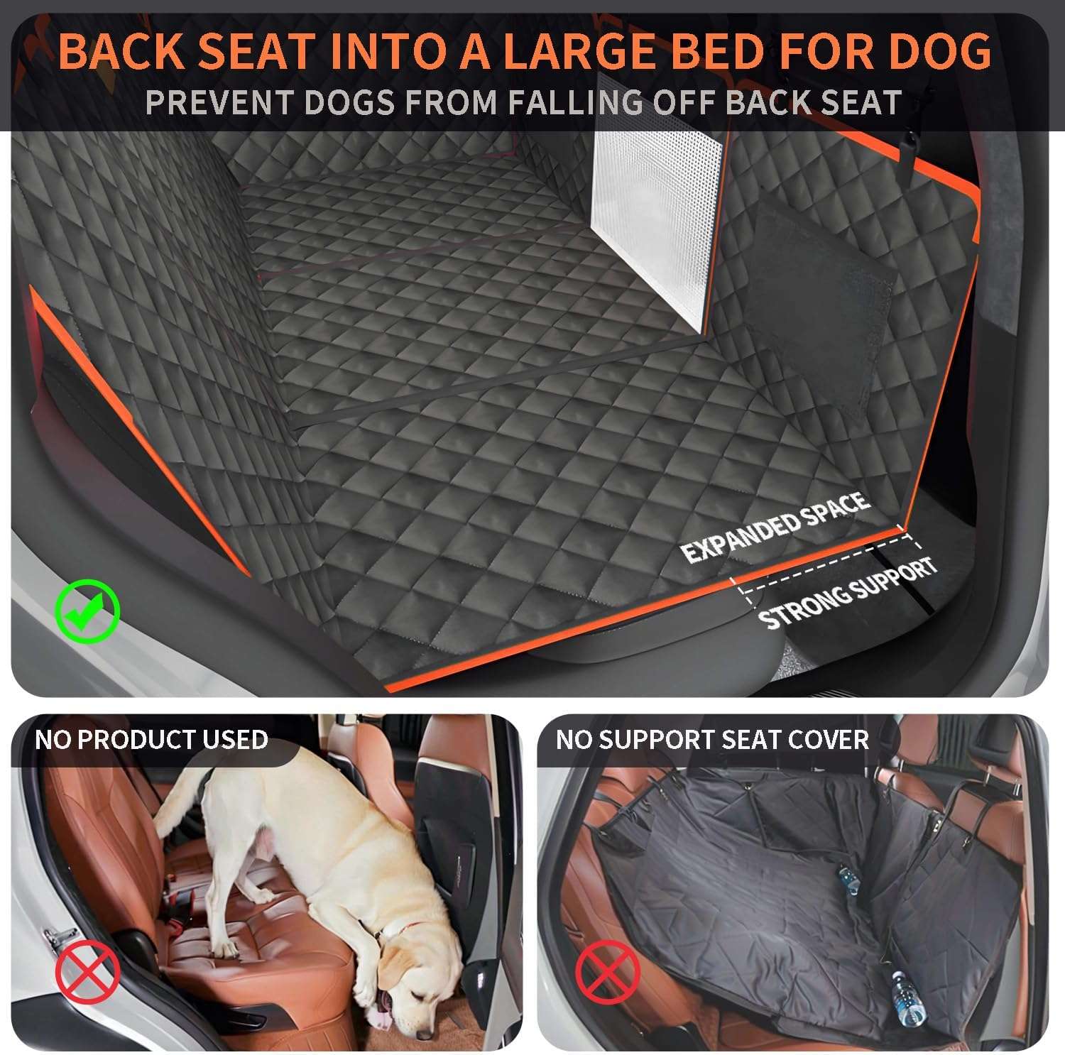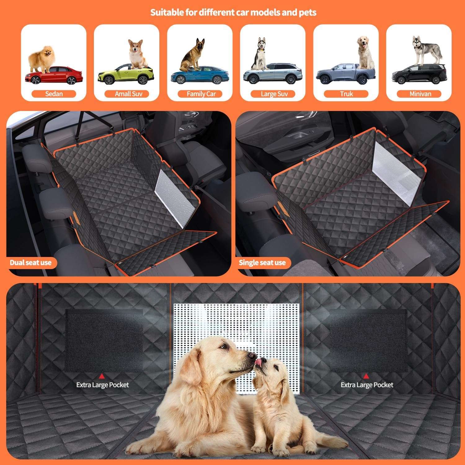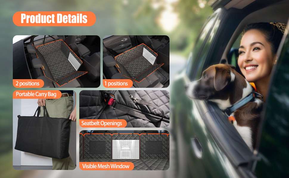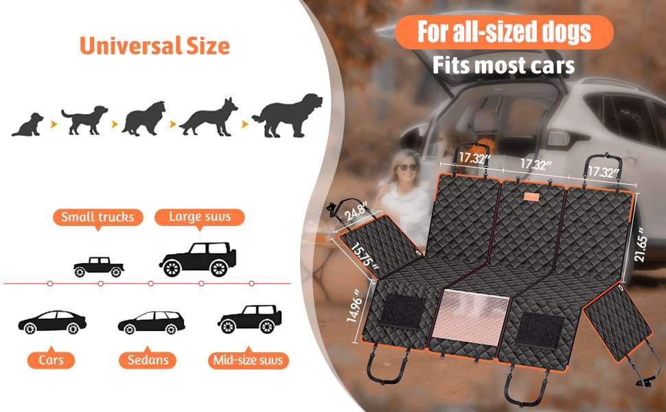 Diseno Modificable y Fondo Duro Ajusta el espacio a tu medida. Con un tamano total de 132 por 156 centimetros, esta funda cubre completamente el asiento trasero de la mayoria de los autos, camionetas y vehiculos familiares SUV. Su gran ventaja es que cuenta con un extensor de fondo duro y se puede dividir en tres piezas. Asi, puedes usarla completa como hamaca, adaptarla para que viaje un pasajero junto al perro, o instalarla como protector para el maletero.
