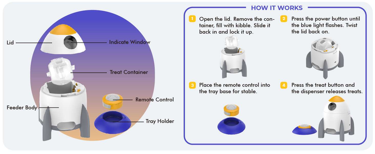 Función principal: Dispensador inteligente que libera golosinas cuando el perro presiona el botón inalámbrico.