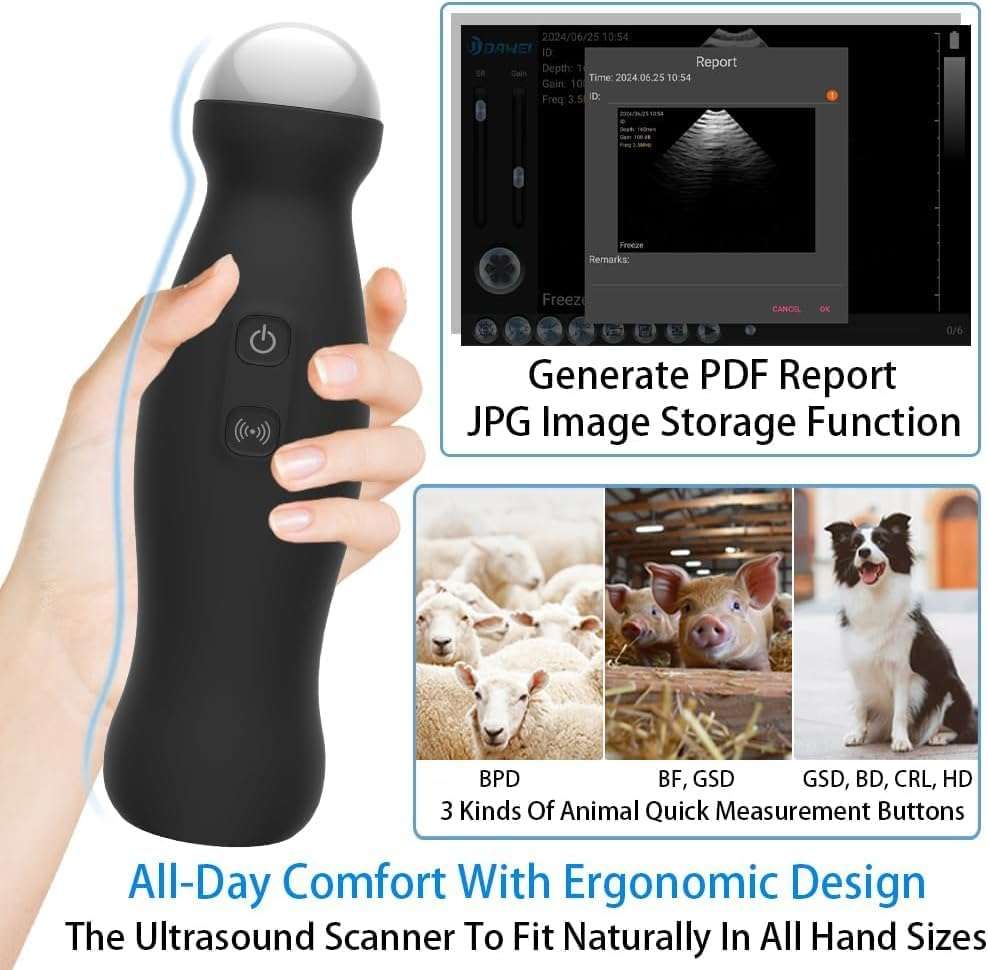 Este ecógrafo portátil redefine la inspección veterinaria, ofreciendo una solución totalmente inalámbrica y extremadamente resistente para diagnósticos en campo, granja o clínica. Se conecta directamente a tu dispositivo móvil para una operación flexible y eficiente.