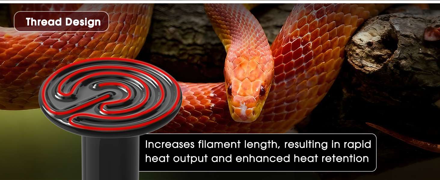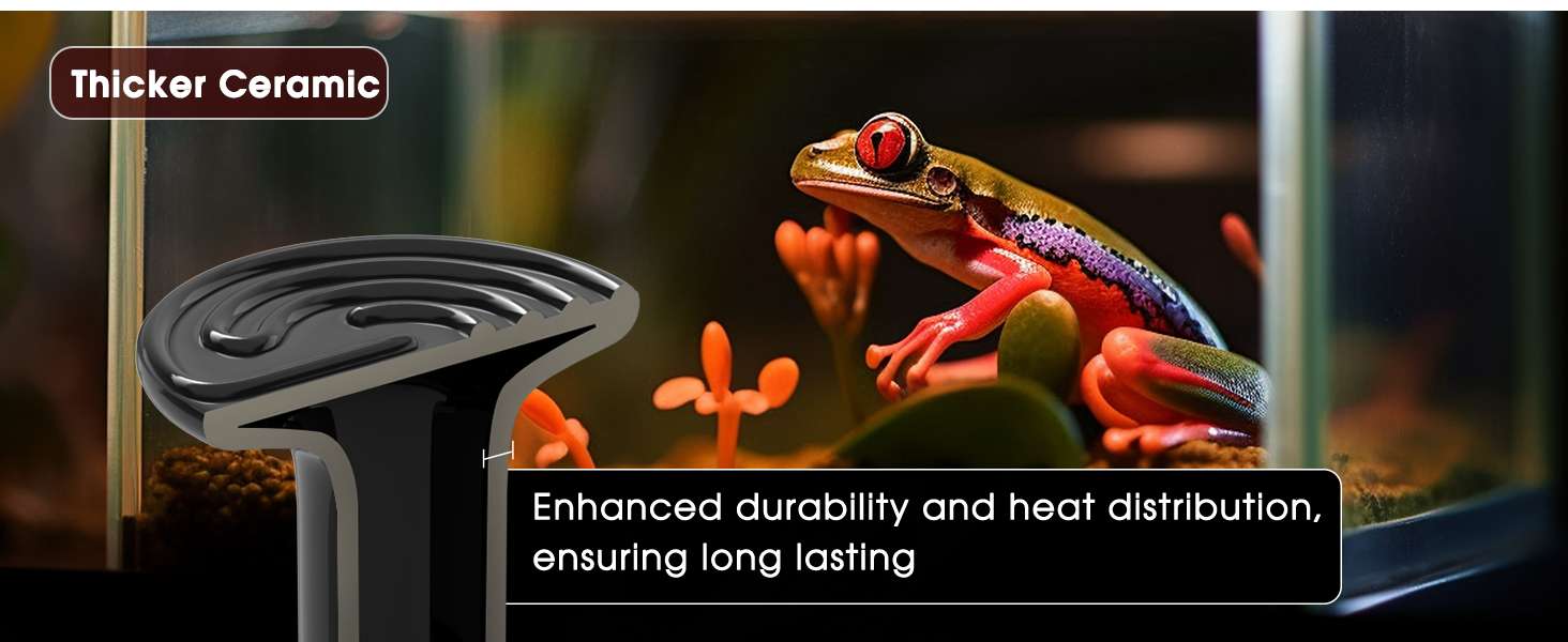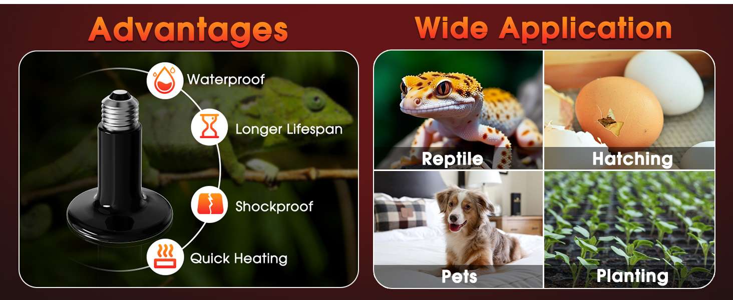 Lámpara de calor versátil para mascotas Nuestras bombillas de calor de reptil negro están diseñadas para atender a una amplia gama de animales. Ya sea que tengas reptiles, pájaros, pollos, pequeños mamíferos u otras mascotas, esta versátil lámpara de calor proporciona la temperatura y comodidad ideales que necesitan.