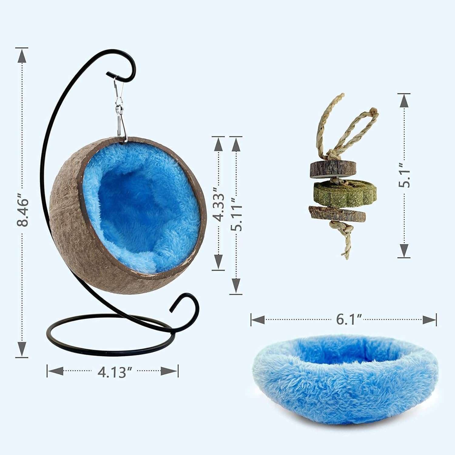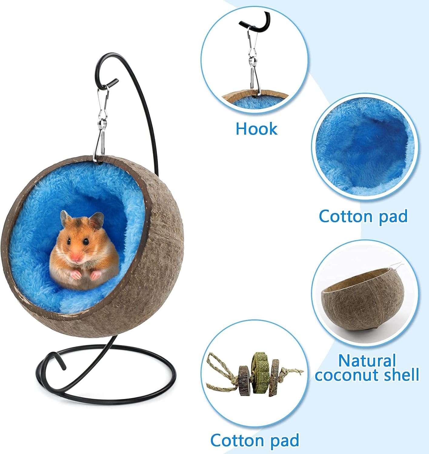 El paquete incluye: escondite de cáscara de coco natural, cojín de esponja suave, cuerda de dientes divertida, ganchos para colgar.