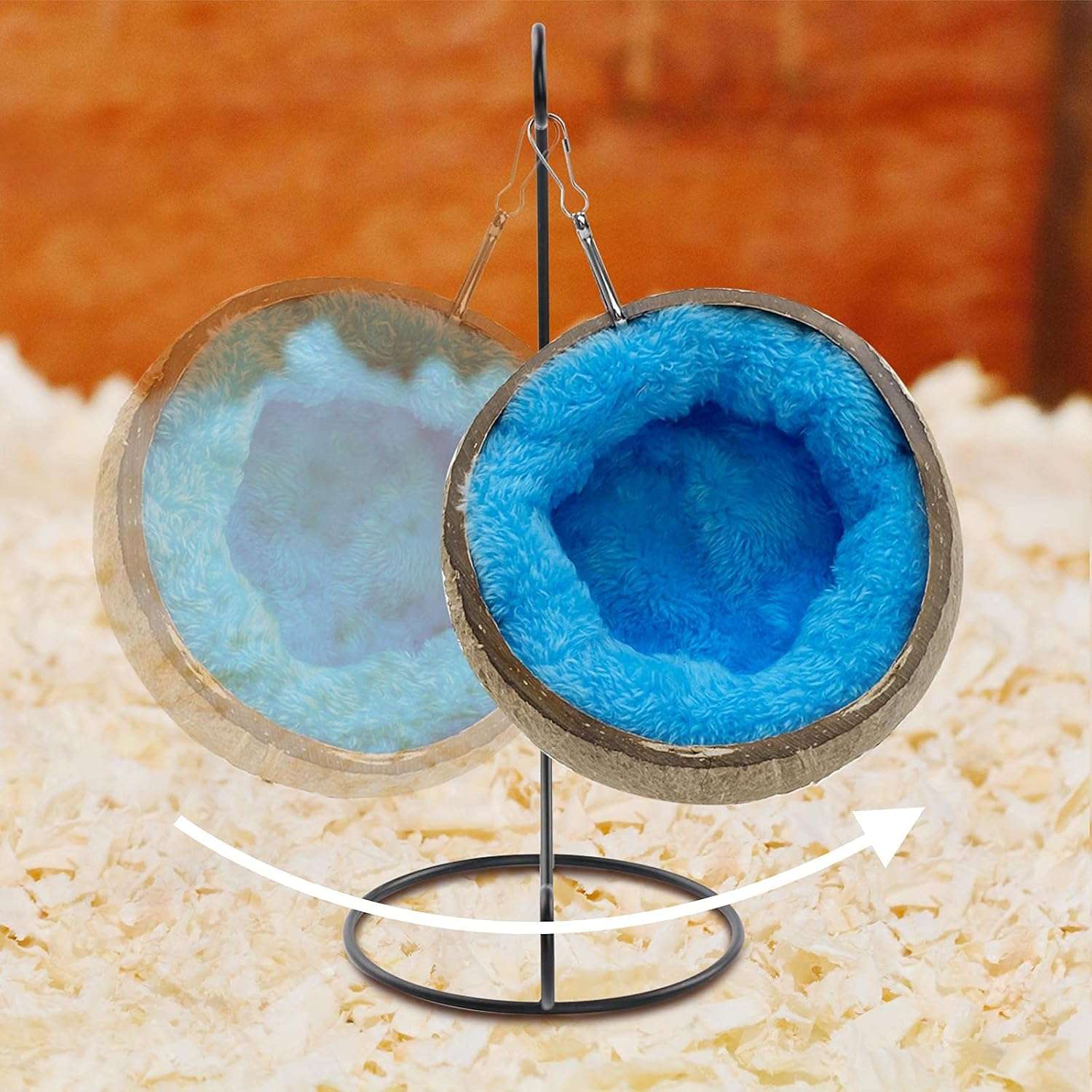 Hermoso cojín cálido: la cama para hámster está suspendida y equipada con un cálido cojín. Cuando hace frío, se puede rellenar en la cáscara de coco para proporcionar un calor para el hámster. Cuando hace calor, el cojín se puede quitar para proporcionar un hábitat fresco.