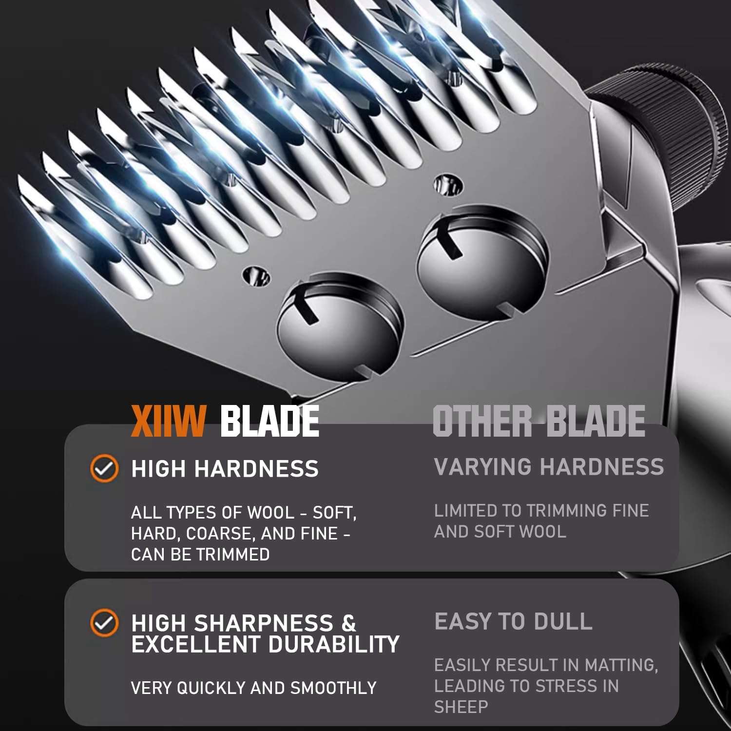 Cuchillas Profesionales de Acero: Las cuchillas de corte estan hechas de acero de alta calidad para maxima durabilidad. Incluye un peine inferior de 13 dientes y un cortador de 4 dientes, ideales para ovejas, cabras, llamas y alpacas. Nota: No usar en perros o gatos debido a su potencia.