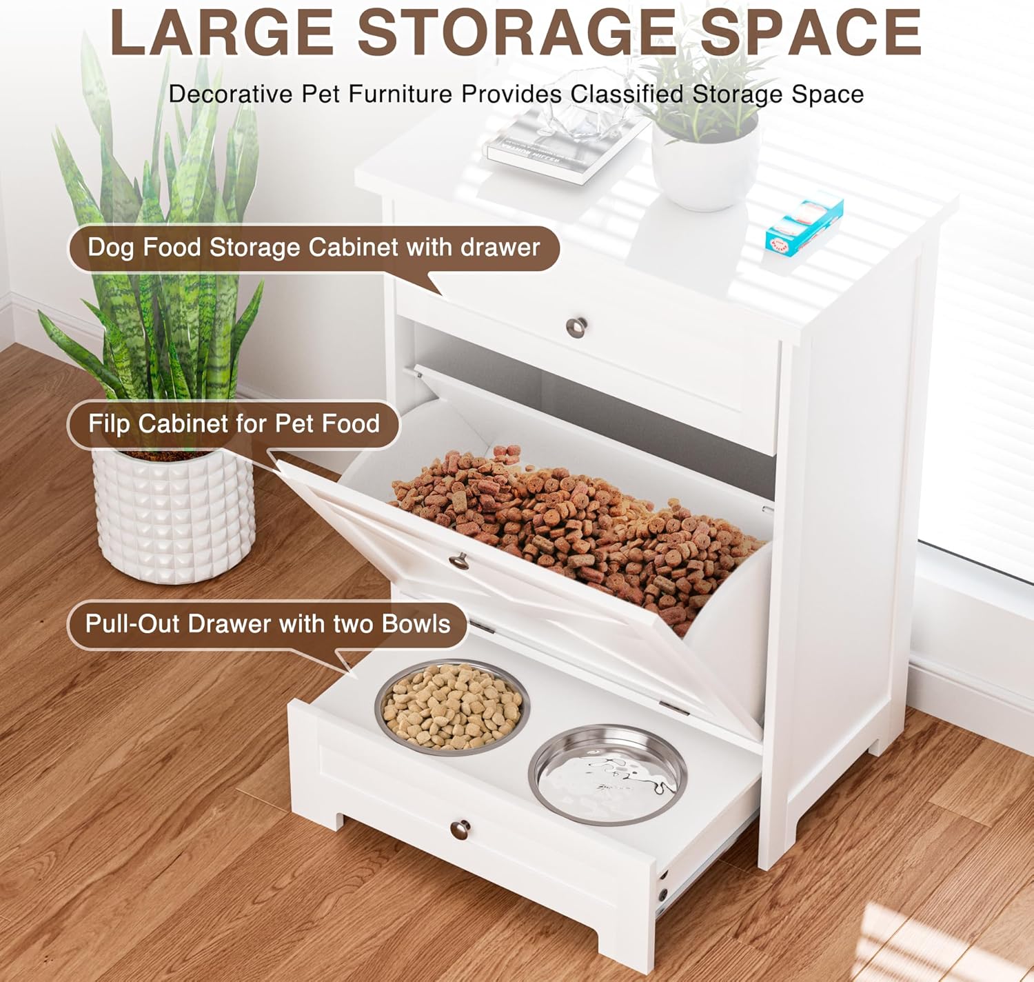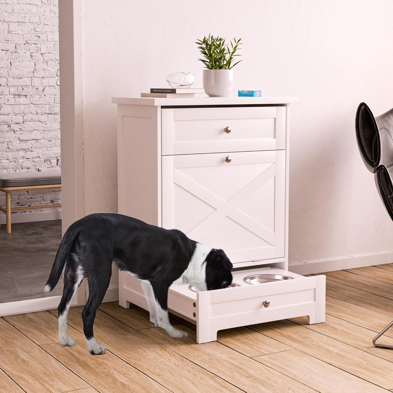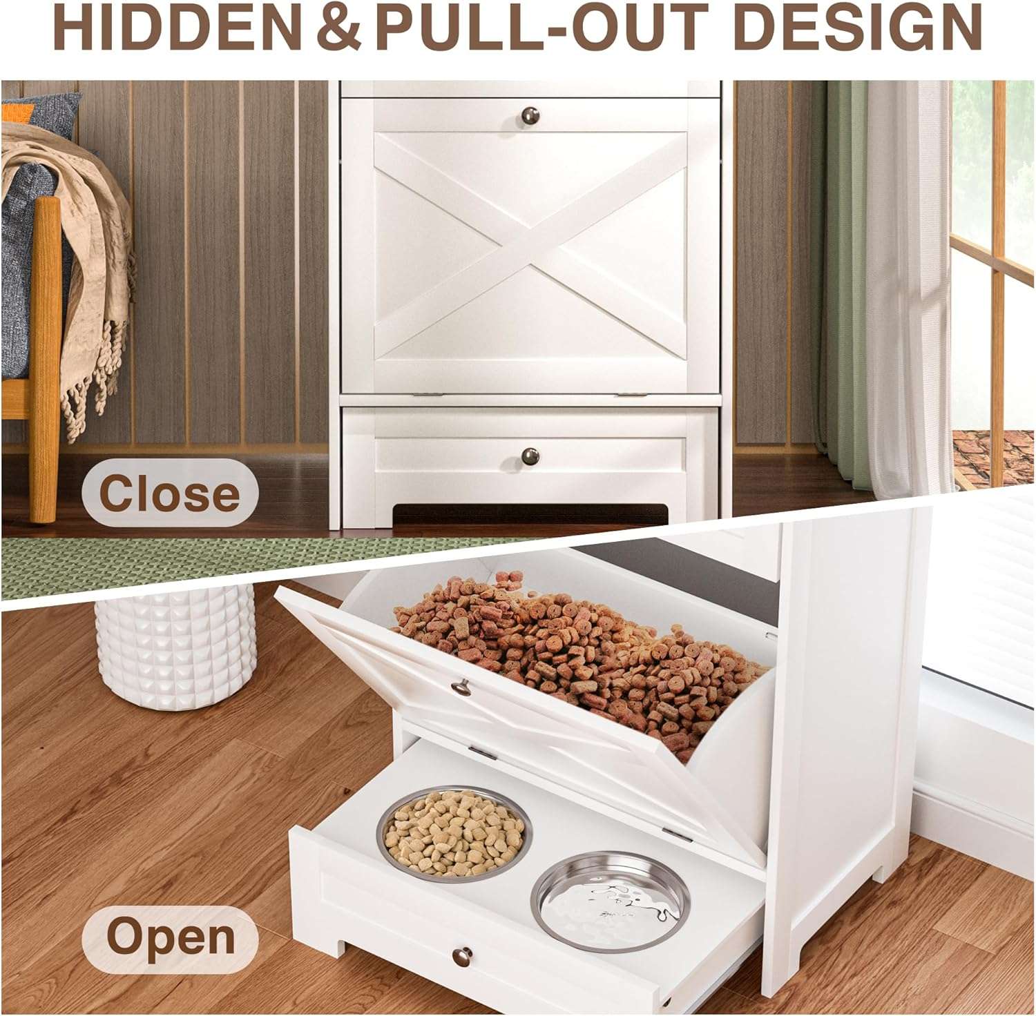 Cajón deslizable con platos de acero inoxidable El mueble cuenta con un cajón inferior que incluye dos pocillos de acero inoxidable de alta calidad. Al terminar la hora de comida, simplemente deslice el cajón hacia adentro para ocultar los platos. Esto evita tropiezos, mantiene el piso despejado y asegura que los platos no se llenen de polvo.
