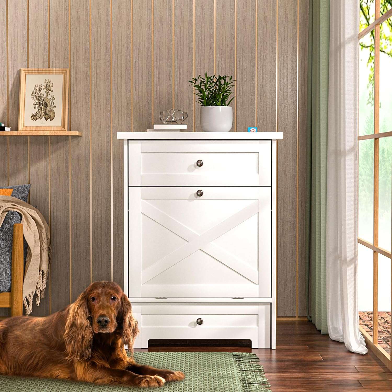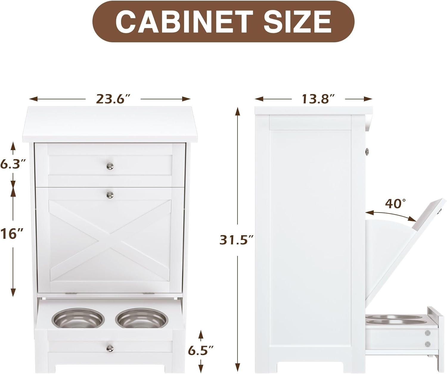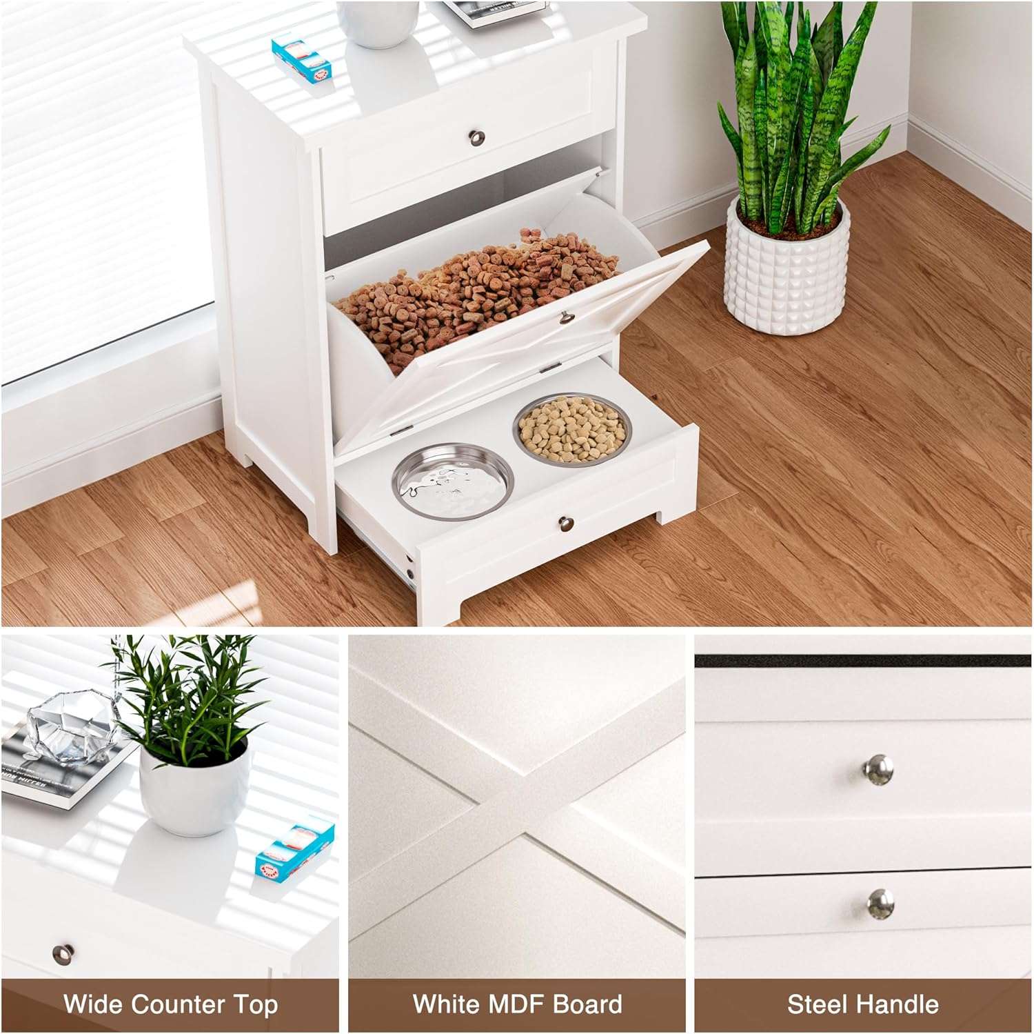 Cajón deslizable con platos de acero inoxidable El mueble cuenta con un cajón inferior que incluye dos pocillos de acero inoxidable de alta calidad. Al terminar la hora de comida, simplemente deslice el cajón hacia adentro para ocultar los platos. Esto evita tropiezos, mantiene el piso despejado y asegura que los platos no se llenen de polvo.