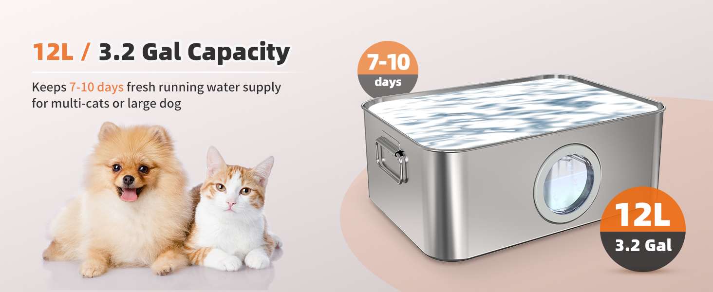 Diseñada para las exigencias reales de perros de razas grandes y hogares con múltiples mascotas. Su impresionante tanque de 12 Litros (3.2 galones) ofrece el área de bebida más profunda y amplia del mercado, permitiendo que varios perros beban cómodamente al mismo tiempo sin salpicar. Olvídate de rellenar el plato varias veces al día; esta fuente garantiza suministro de agua para toda la “manada” durante días.