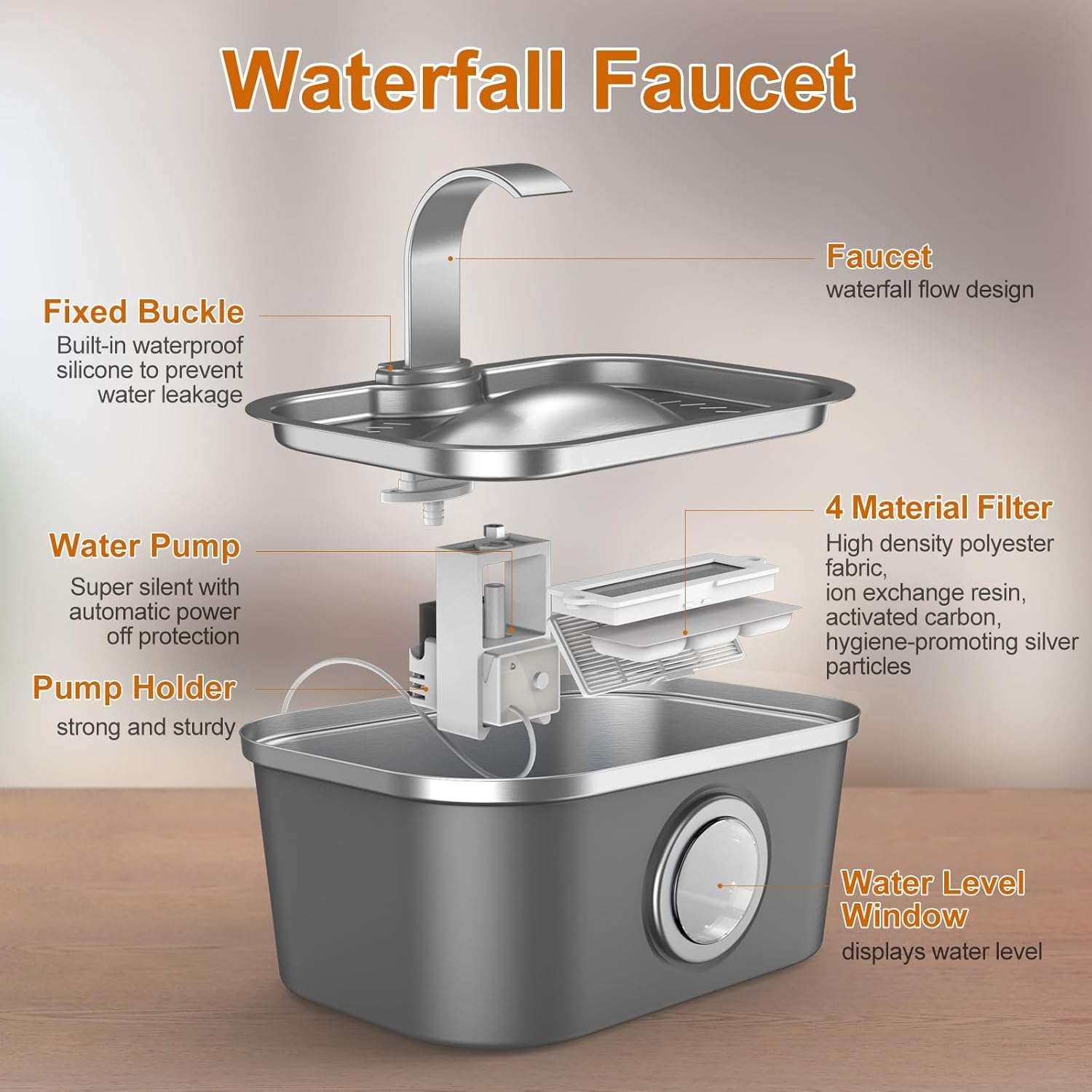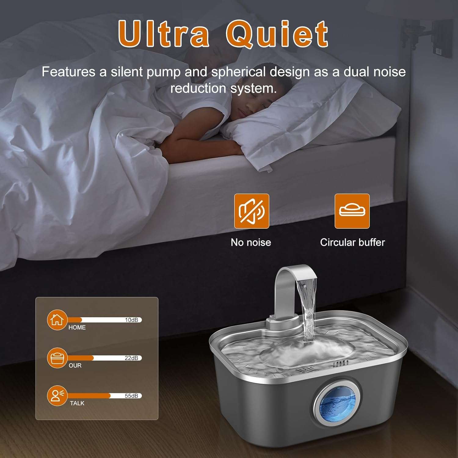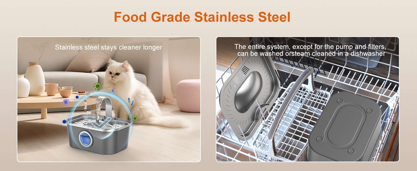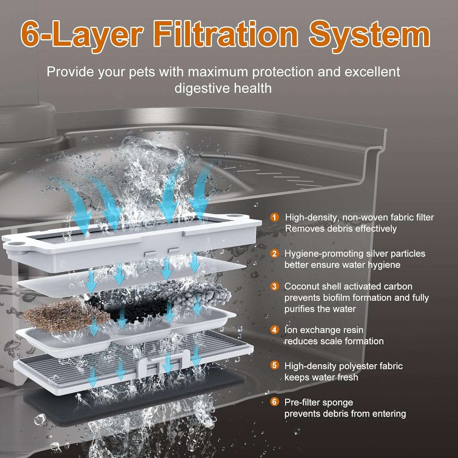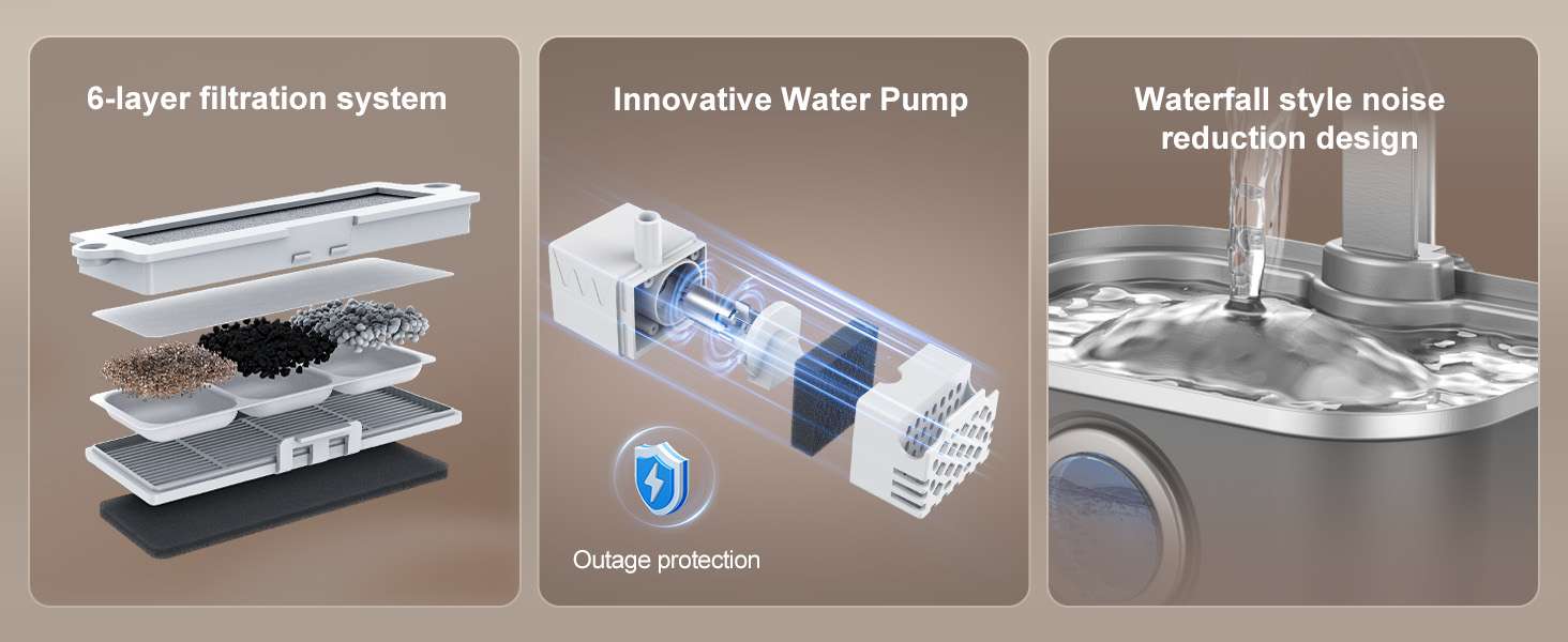 La salud de tus mascotas es nuestra prioridad. Nuestro sistema de filtración supera a la competencia con 6 capas de purificación, incluyendo partículas de plata, carbón de coco y resina iónica. Esto elimina metales pesados y bacterias, previniendo problemas urinarios. Además, es ultra silenciosa (menos de 23 dB) y cuenta con apagado automático si el agua se agota, protegiendo el motor y tu hogar.